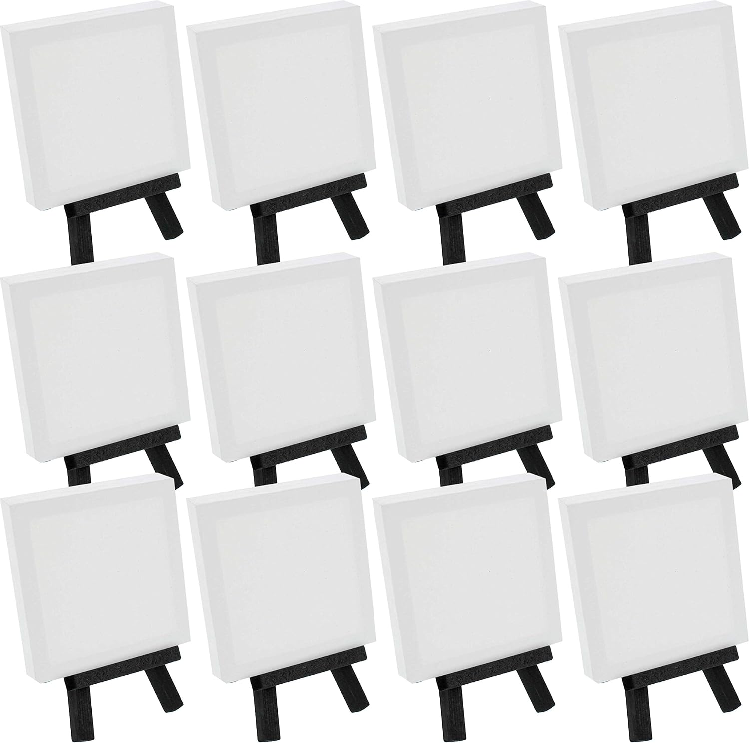 U.S. Art Supply 3" x 3" Stretched Canvas with 5" Mini Easel Kit (12 Pack) - Black Wooden A-Frame Tabletop Display Stand, Mini Easel Stand - Small Easels for Display, Small Canvases, Crafts, Photos