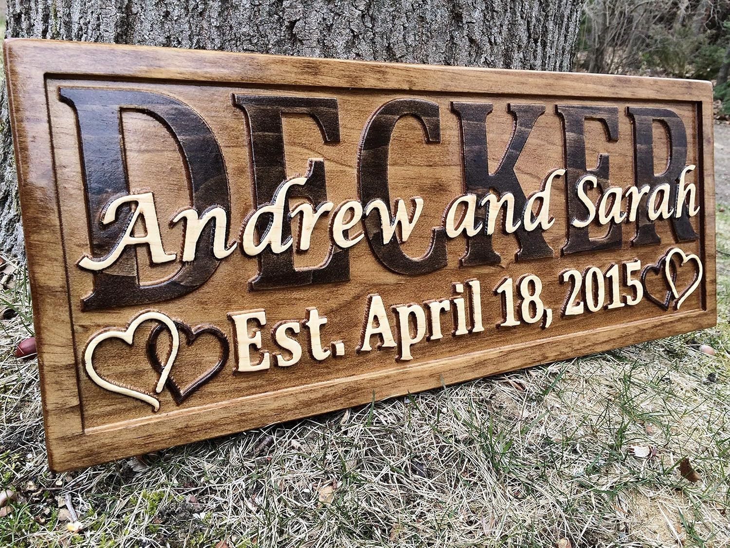 Personalized Wedding Gift Last Name Established Sign Family Name Signs Custom Wood Sign Carved Wood Sign 3D Hearts 5 Year Anniversary