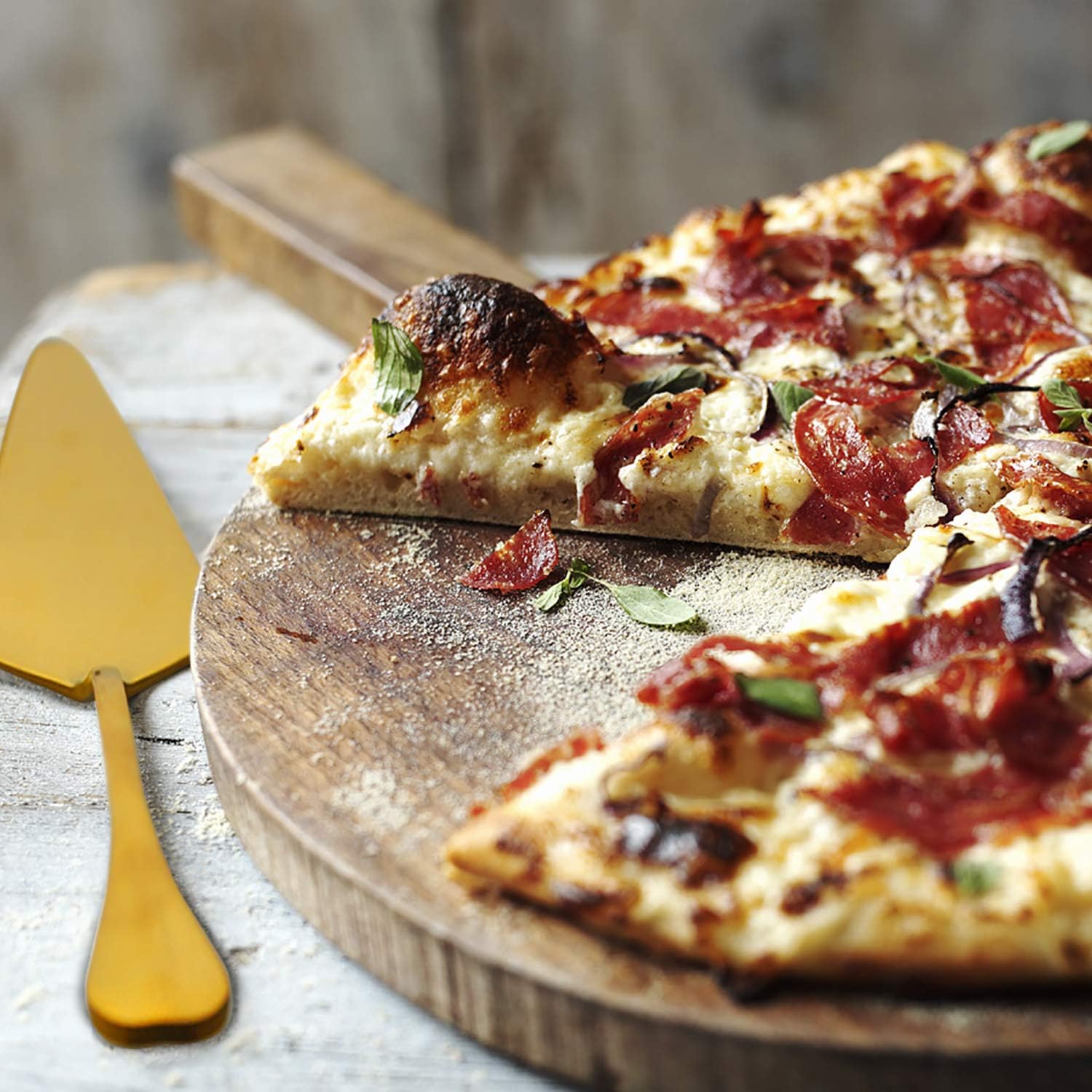 - Triangular-headed Design Gold Pizza Server: Working ends are modern, functional and comfortable, easy lifting of each slice. Great used for special events or daily used.