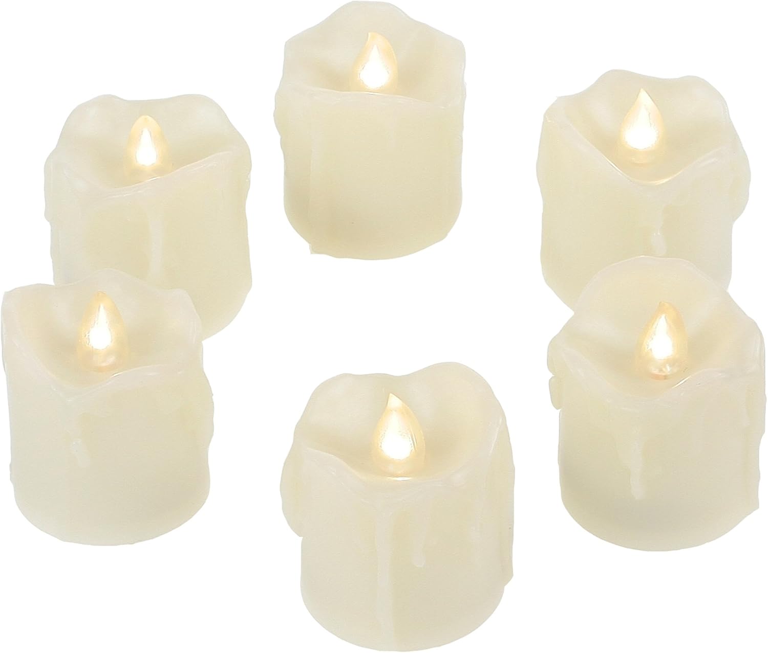 - Realistic look and flicker. These top quality battery votive candles / tea lights are made of flickering LED bulb and plastic with real wax appearance. The small resin candles flicker like real candles and give off soft glowing light. In addition, battery powered LED candle lights are safe to use with and environment friendly, especially when you have kids, seniors and pets at home. No risk of fire, no fume and no CO2 emissions.