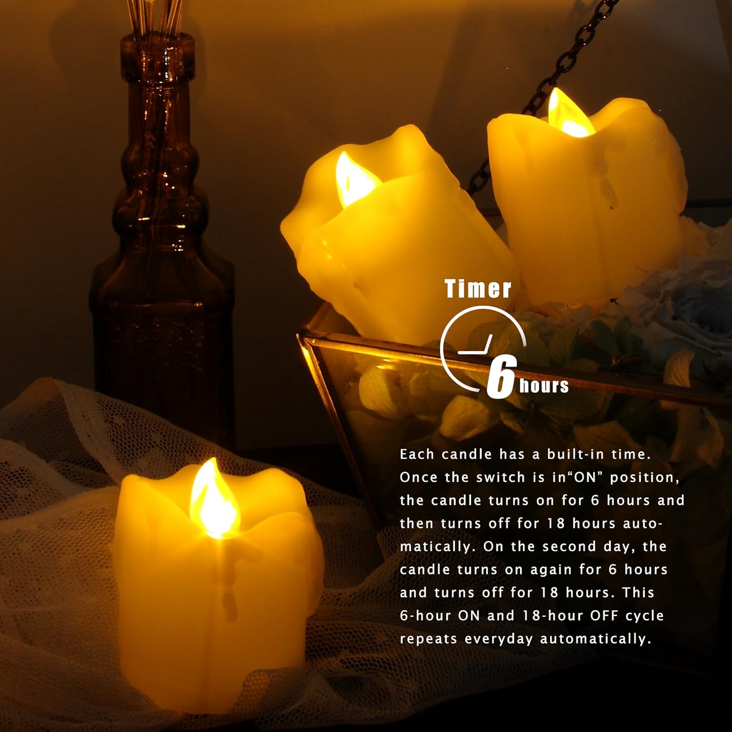 - 6-hour daily cycle timer. Each battery operated LED flameless candle has a built-in timer. Once the LED votive candles / tea lights are turned on, they stay on for 6 hours and then turn off automatically for the next 18 hours. And this daily cycle repeats automatically. The auto timer function saves the trouble of turning on and off these flameless tea lights manually every day.