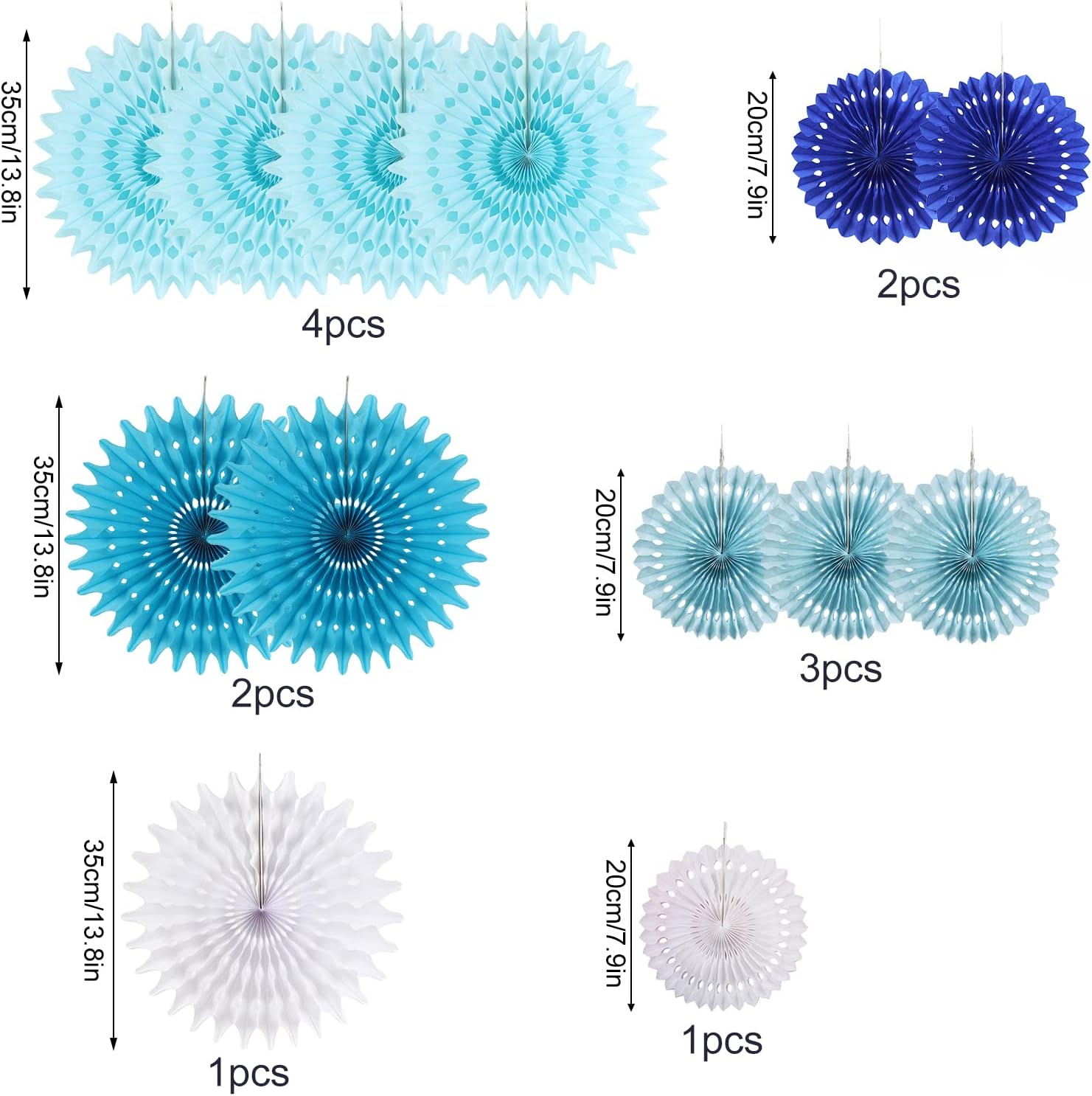 - Vibrant and Eye-Catching: These 13 PCS Blue White Hanging Paper Fans Party Decorations are designed to add a pop of color and excitement to any event or celebration. The combination of blue and white creates a refreshing and visually appealing atmosphere.