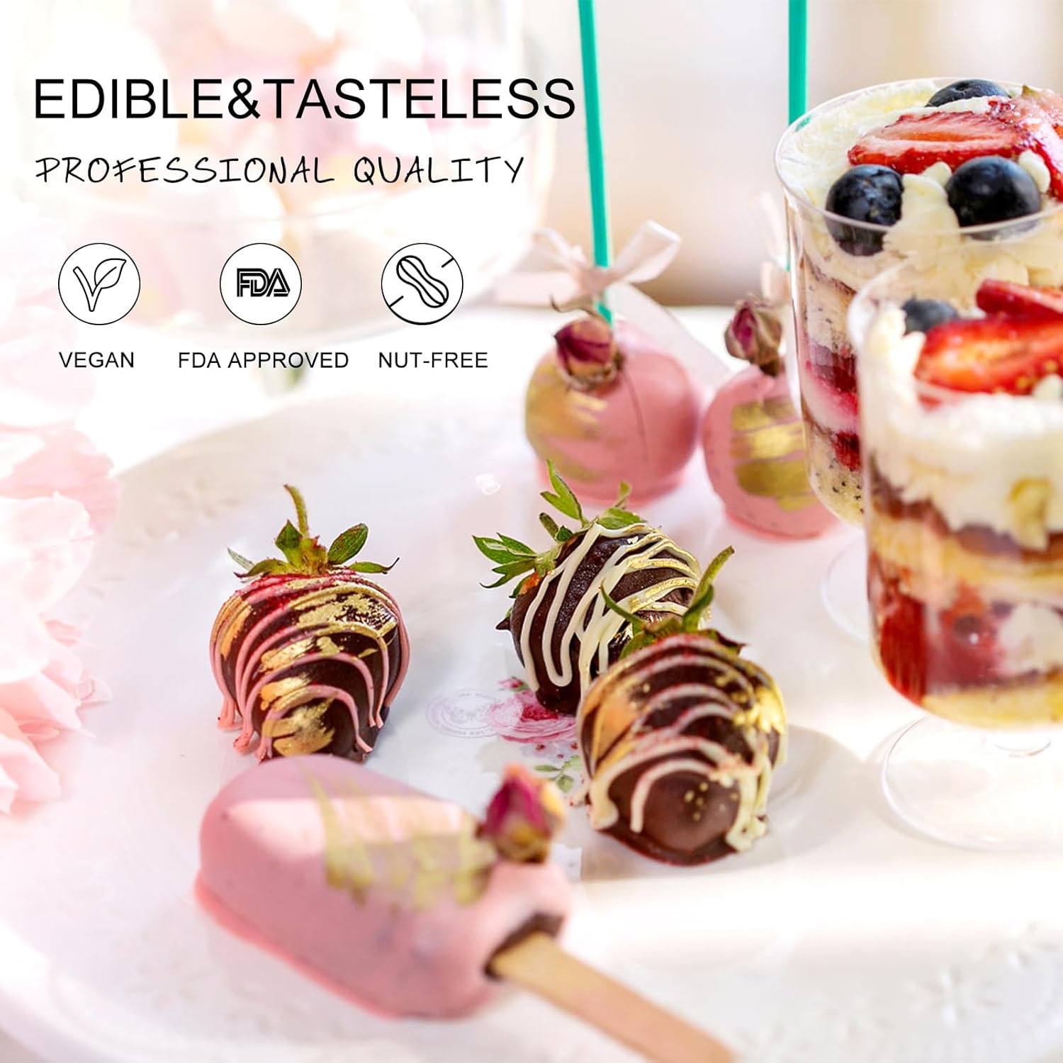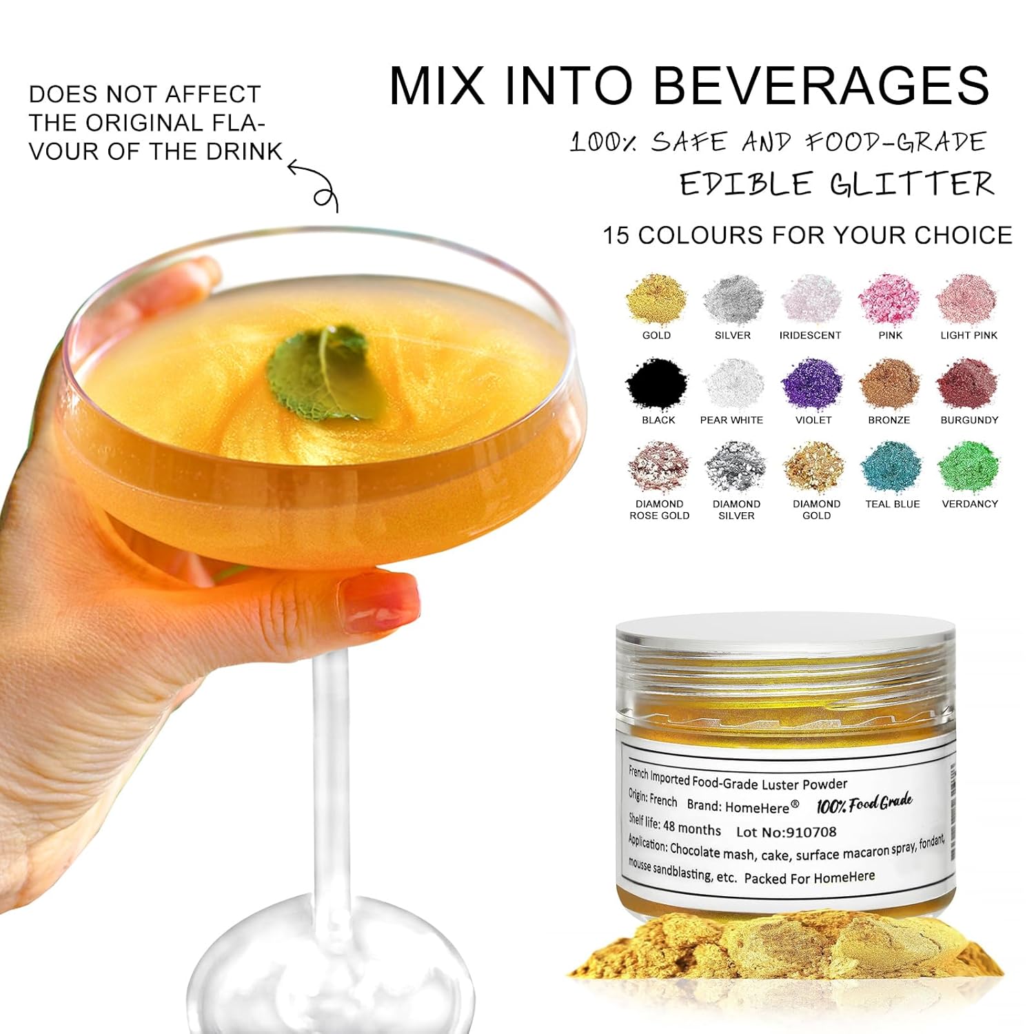 - EASY TO USE: Add edible dust directly to the surface being decorated, or use the luster of edible dust with alcohol (vodka is recommended) or an alcohol-based extract like lemon extract for a matte effect. It only takes a few drops and mixes until the luster dust has the consistency of paint. You can also DIY all kinds of shiny drinks, just add a little edible shine to your drink and you will have a glamorous cocktail, champagne, or any drink that everyone exclaims for you!