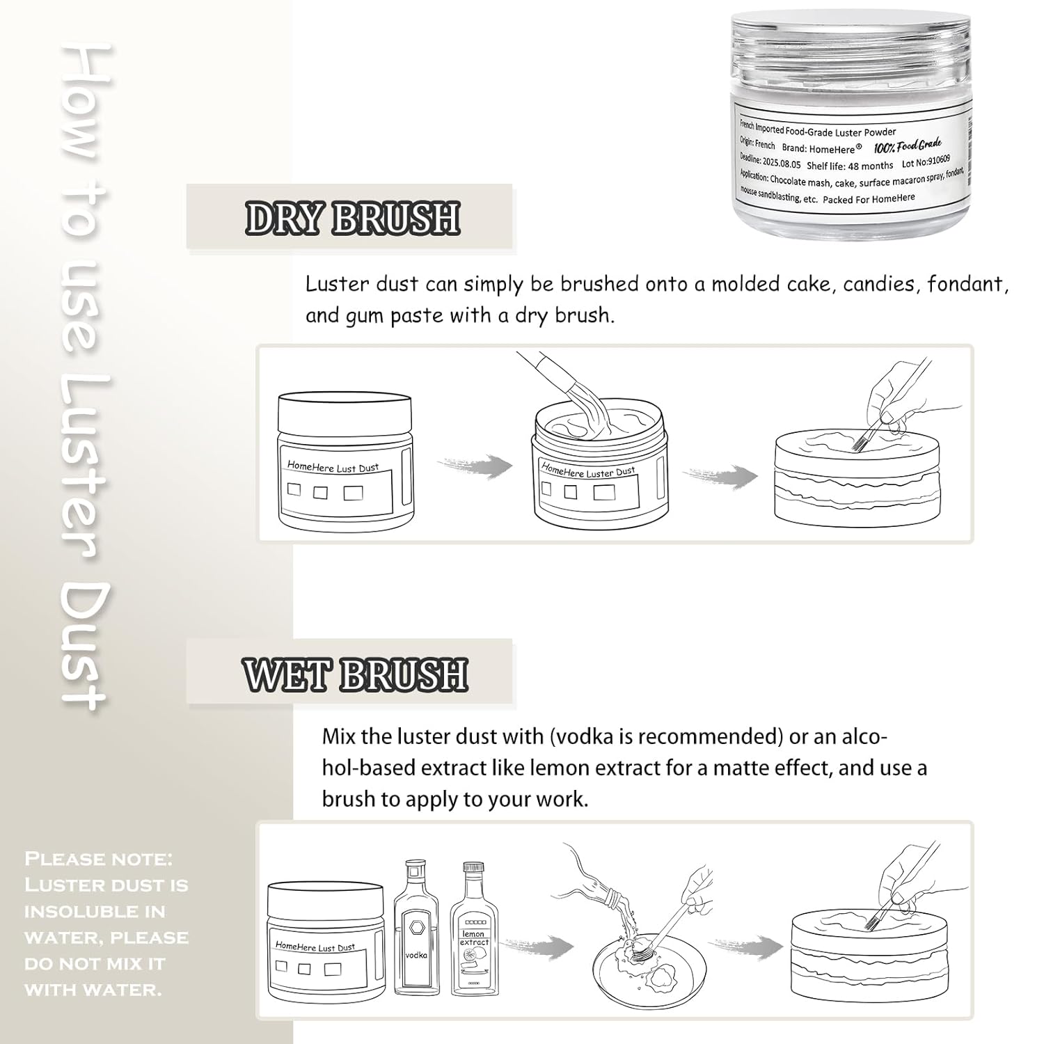- EASY TO USE: Add edible dust directly to the surface being decorated, or use the luster of edible dust with alcohol (vodka is recommended) or an alcohol-based extract like lemon extract for a matte effect. It only takes a few drops and mixes until the luster dust has the consistency of paint. You can also DIY all kinds of shiny drinks, just add a little edible shine to your drink and you will have a glamorous cocktail, champagne, or any drink that everyone exclaims for you!