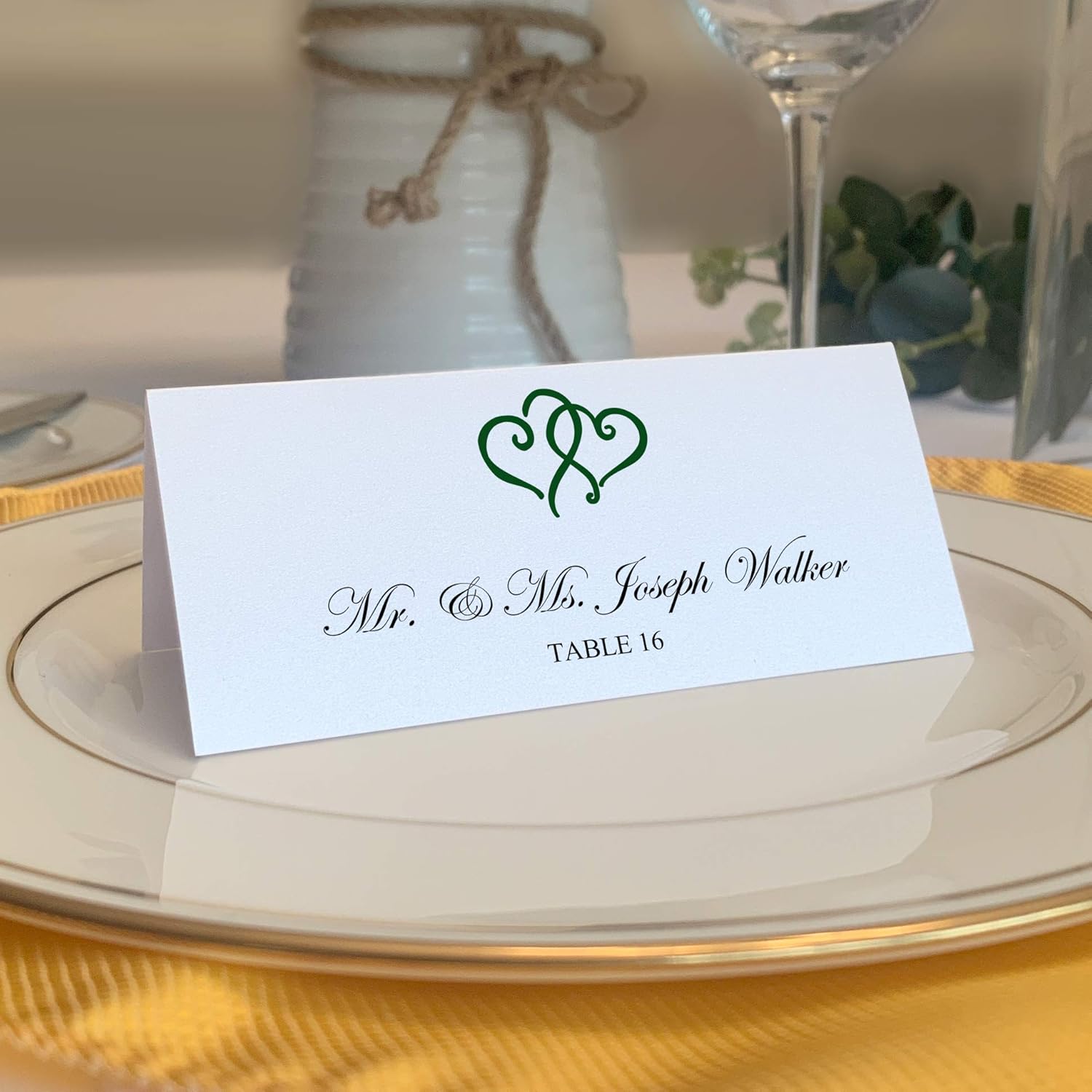 - Features two linked hearts at the top of each place card