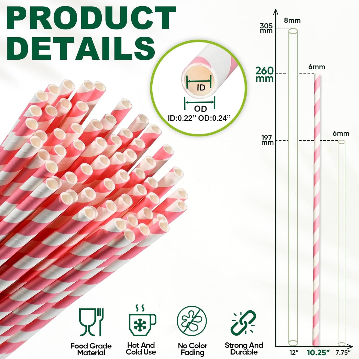 Biodegradable Pink Paper Straws for Drinking - 10 Inches Long, 0.24" Diameter, Pack of 100