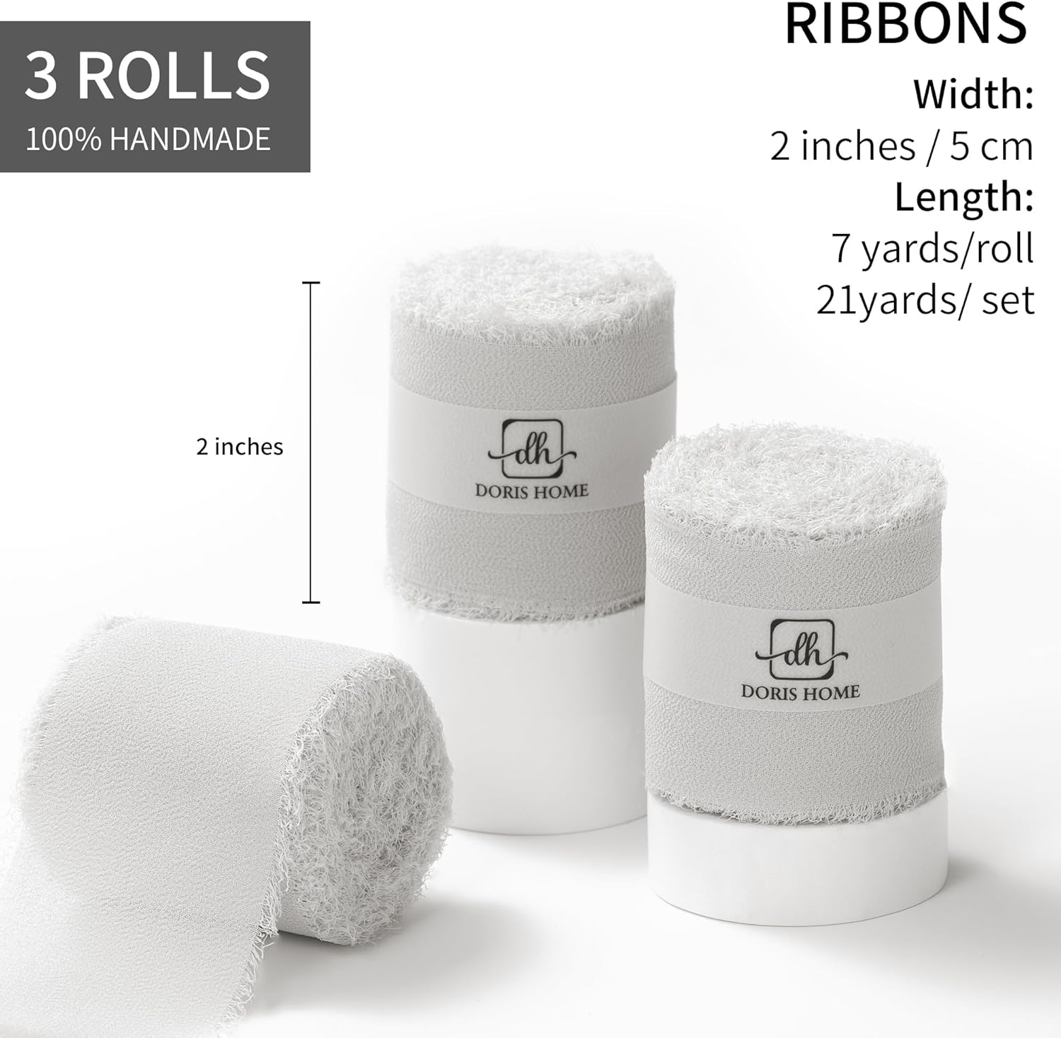 DORIS HOME Light Grey Chiffon Ribbon for Flower Bouquet, 2" x21Yd Fabric Ribbon for Gift Wrapping, Handmade Frayed Ribbon for Wedding, Chiffon Silk Ribbon for Christmas Decorations