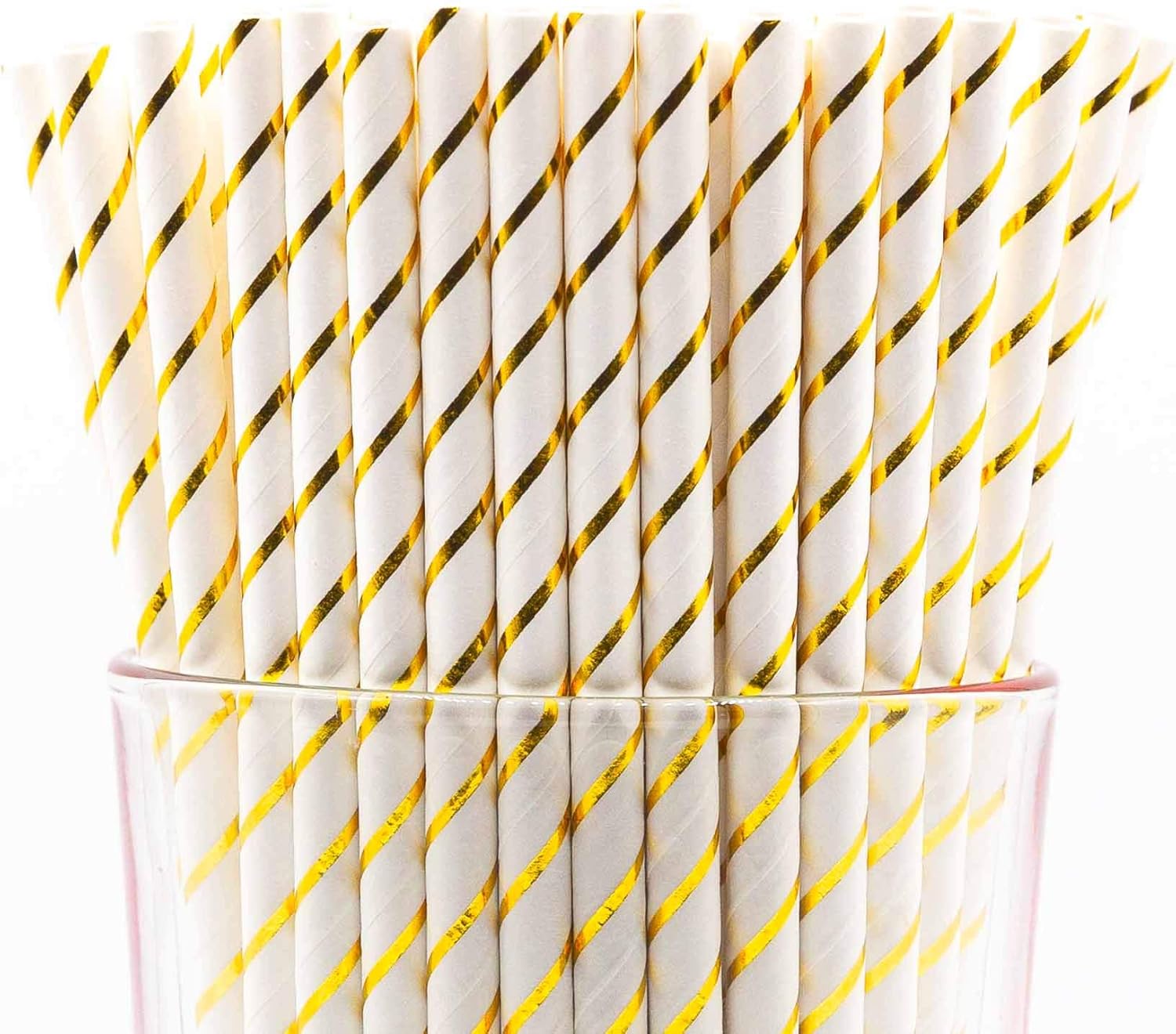 Pack of 300 Gold Foil Stripes Biodegradable 4-Ply Paper Drinking Straws (Compostable, Non-toxic, BPA-free)