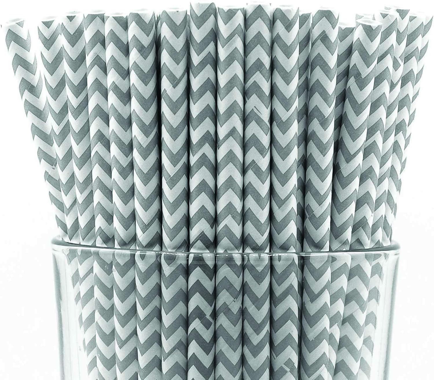 - Pack of 300 Gray Chevron paper straws that are 7.75” long and have a diameter of 0.25”. Made with 4-ply paper which translates into thicker and more resilient straws that won’t wilt or change shape in both hot and cold drinks.