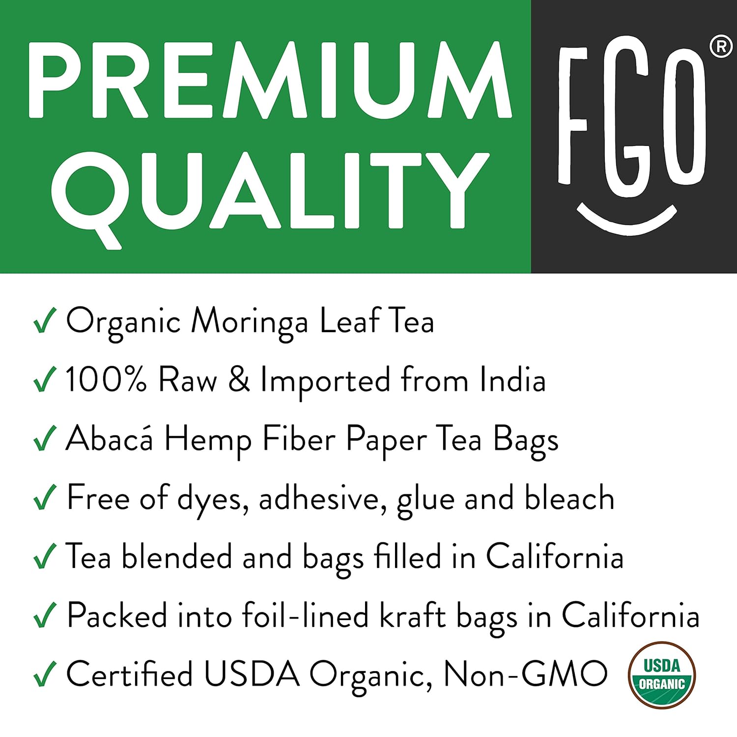 - ORGANIC MORINGA TEA - The tea is filled into tea bags and packed into foil-lined kraft bags in California