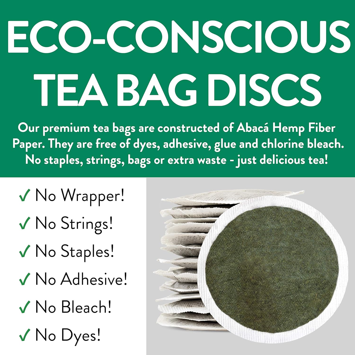 - 100 ECO-CONSCIOUS TEA BAGS - Our premium tea bags are constructed of Abacá Hemp Fiber Paper. They are free of dyes, adhesive, glue and chlorine bleach. No staples, strings, bags or extra waste - just delicious tea!