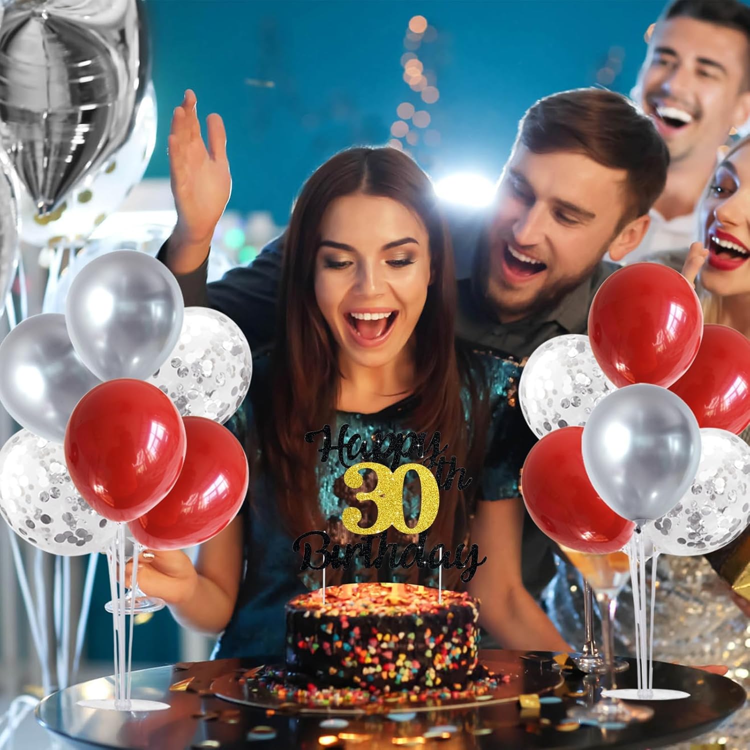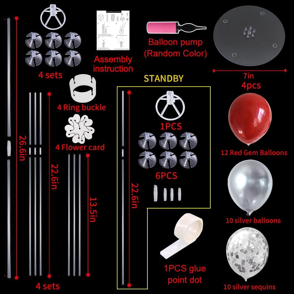 - Package Includes: The balloon stand kit includes 4 reusable balloon centerpiece table decorations and 12 inch 32 pcs Latex Balloons(12 red balloons,10 sliver balloons,10 sliver confetti balloons),glue point dots,balloon pump,balloon clips,and tie tool.You don’t need to waste money to buy balloons