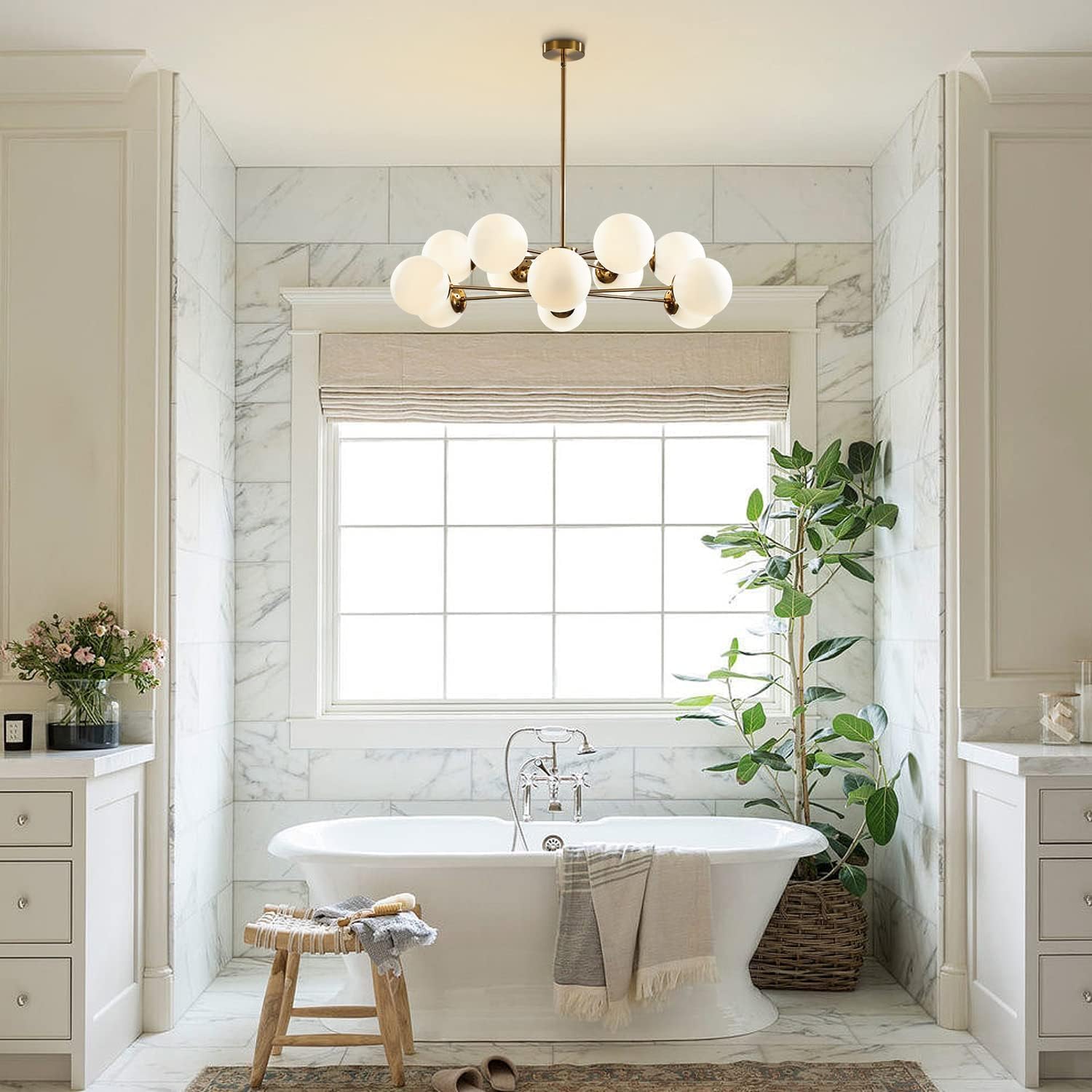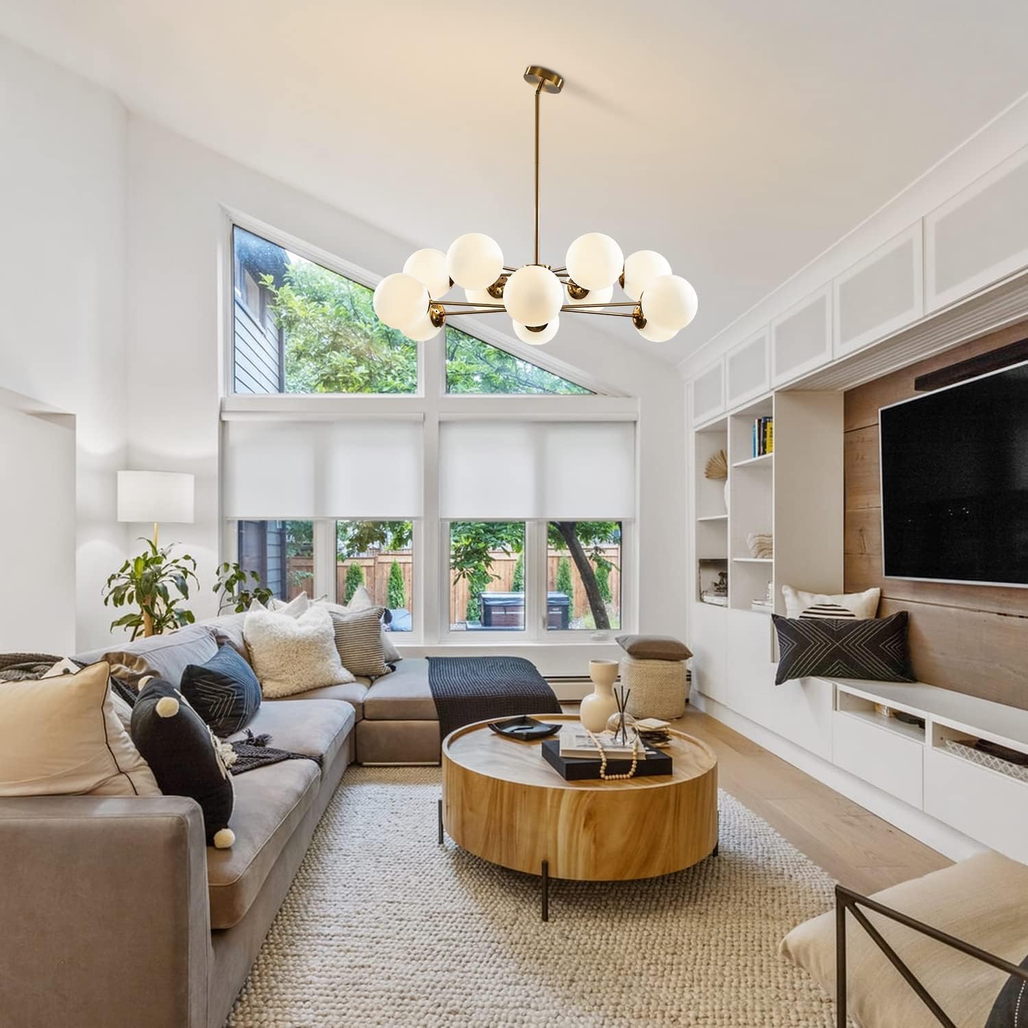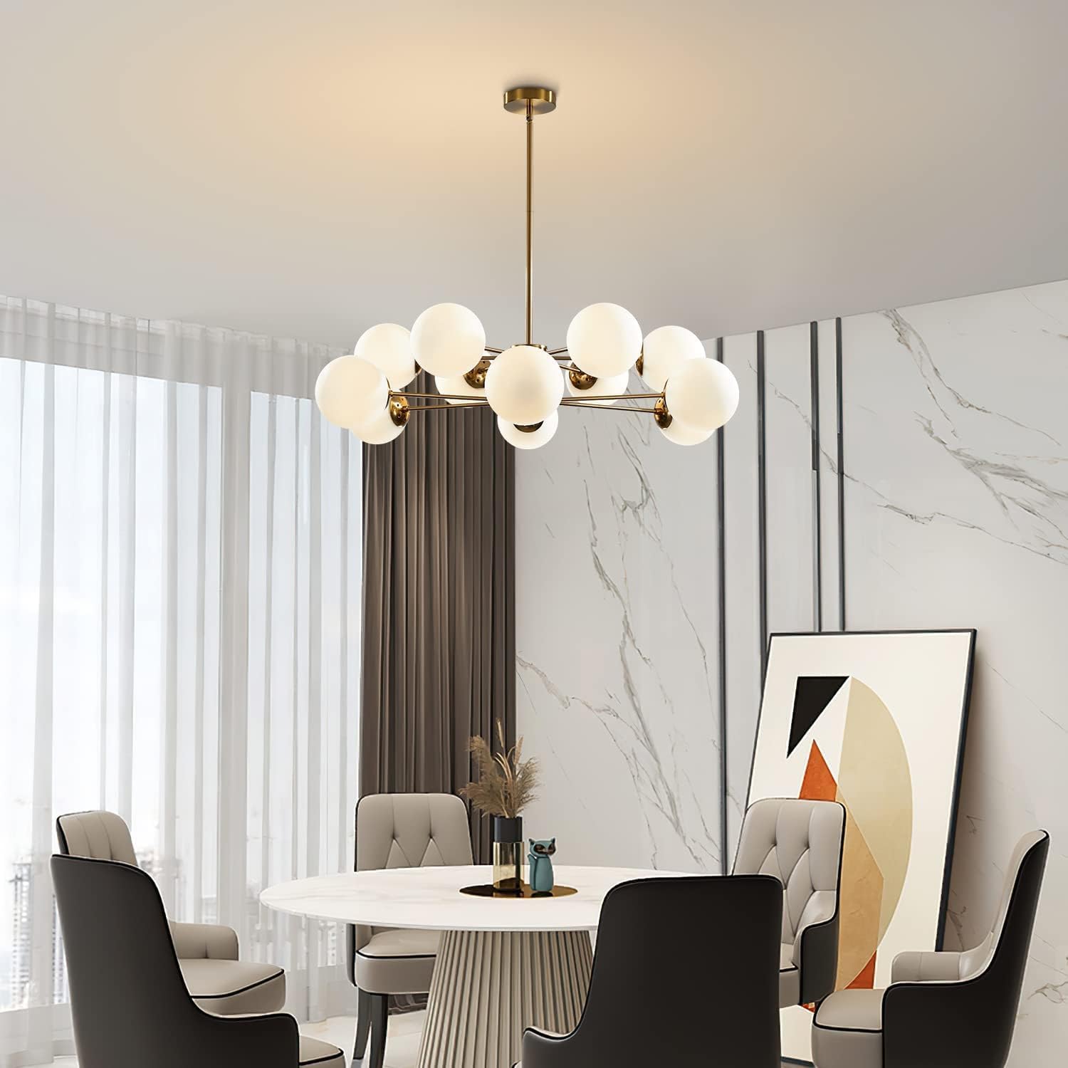 - Modern Glass Globe Chandelier Light Fixture: The gold 12-light sputnik chandeliers composed with milk glass globe lampshade and hanging stems, it's elegant and creative and creates a modern and vintage atmosphere. The classic globe design gives a beautiful and luxurious visual enjoyment