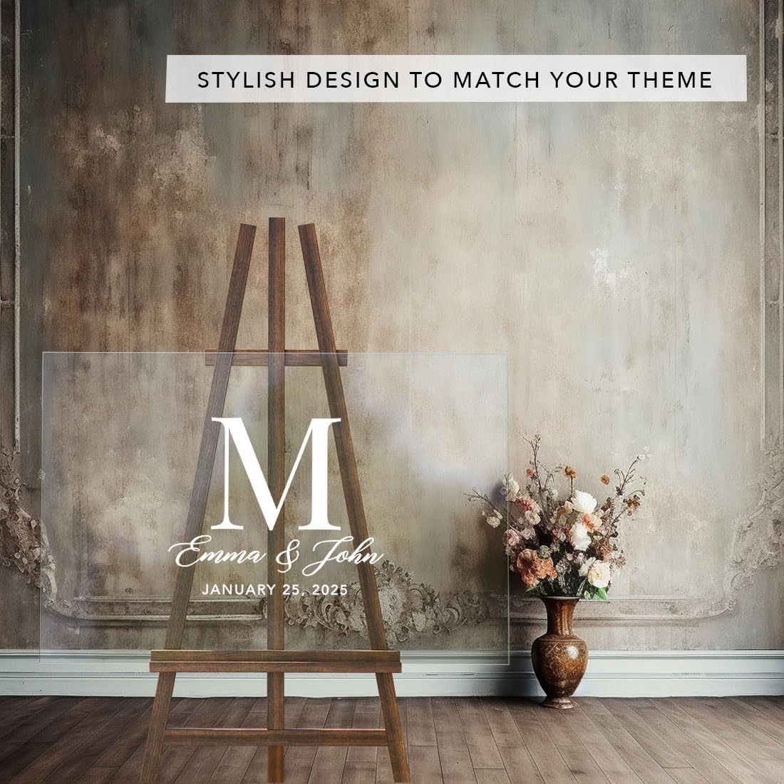 - VERSATILE DISPLAY OPTIONS Your custom names and date are directly printed onto durable acrylic with premium fade-resistant inks. Your sign is peel-proof and smudge proof. Made in USA. Our wedding entrance sign fits all sturdy easels or stands, making this wedding welcome sign without stand perfect for both indoor and outdoor use.