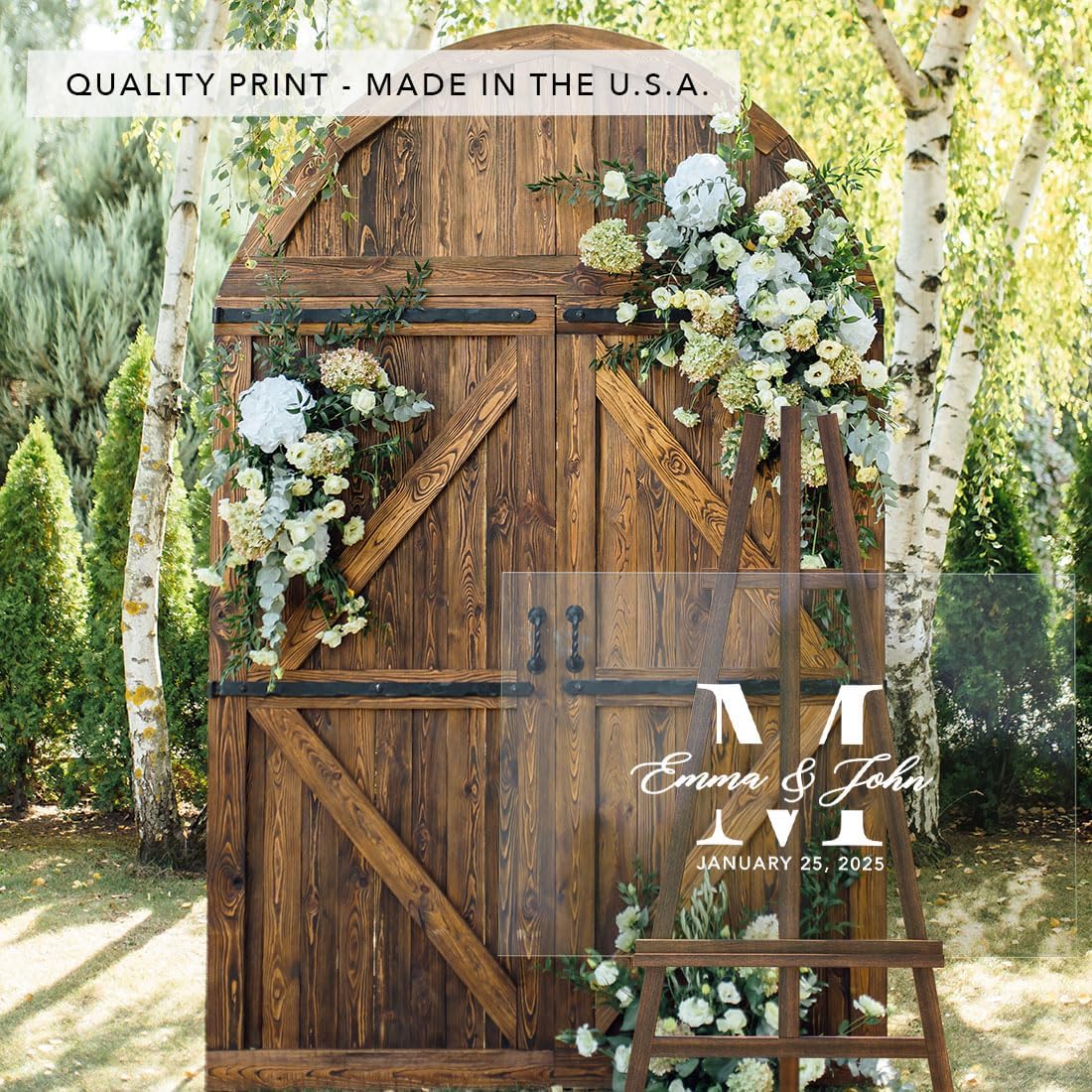 - VERSATILE DISPLAY OPTIONS Your custom names and date are directly printed onto durable acrylic with premium fade-resistant inks. Your sign is peel-proof and smudge proof. Made in USA. Our wedding entrance sign fits all sturdy easels or stands, making this wedding welcome sign without stand perfect for both indoor and outdoor use.