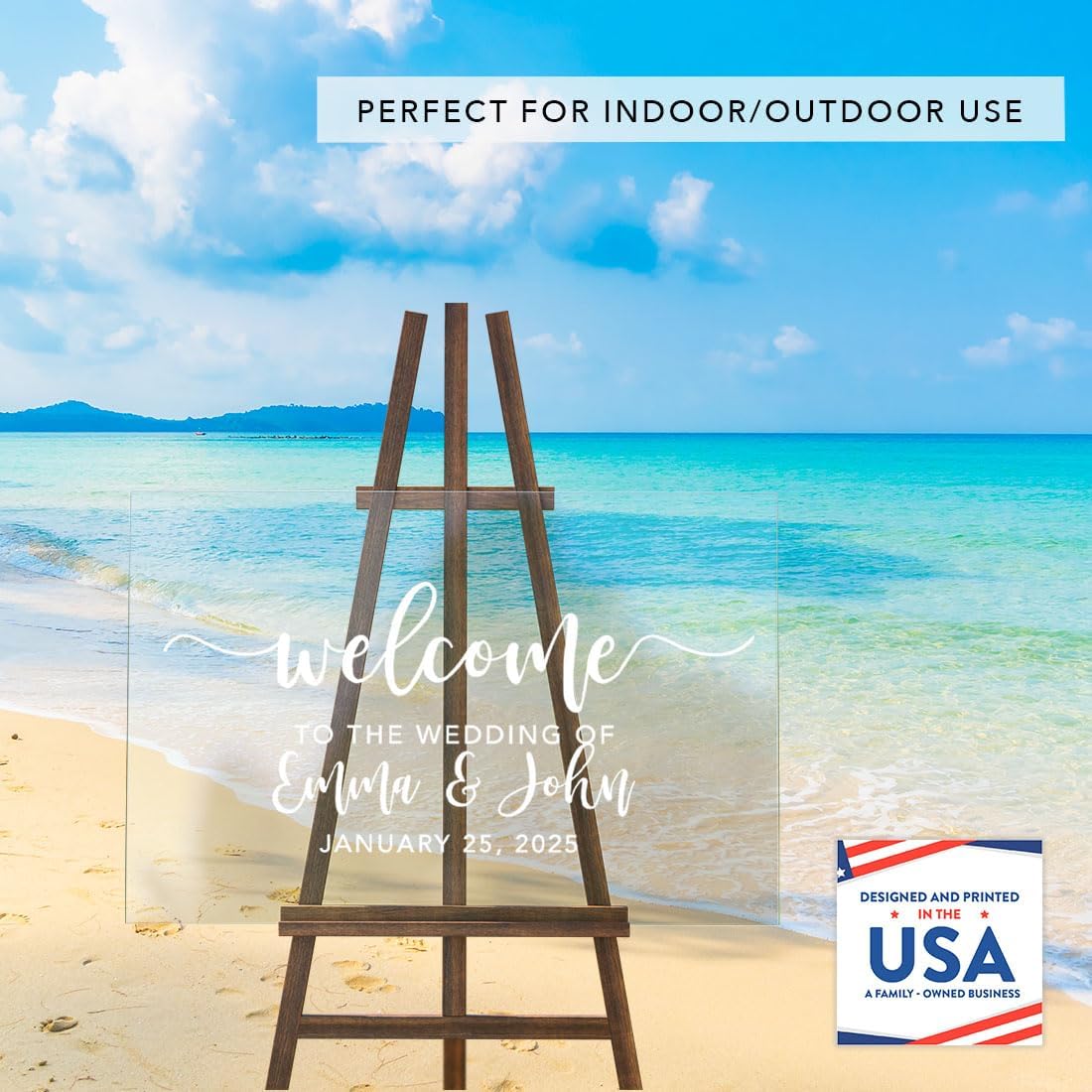 - VERSATILE DISPLAY OPTIONS Your custom names and date are directly printed onto durable acrylic with premium fade-resistant inks. Your sign is peel-proof and smudge proof. Made in USA. Our wedding entrance sign fits all sturdy easels or stands, making this wedding welcome sign without stand perfect for both indoor and outdoor use.