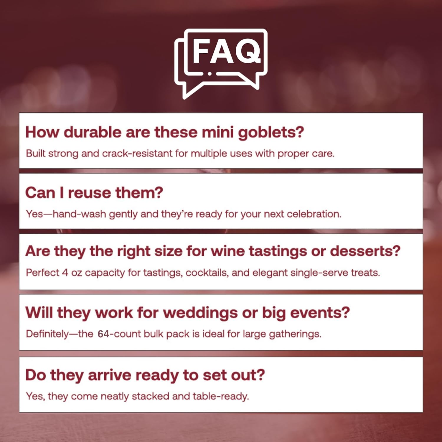 - EVENT-TOUGH & SAFE: Shatter-resistant plastic, BPA-free; stable base resists tipping. Reuse with a gentle hand wash or toss after service. A party-proof nod to unbreakable wine glasses and ideal outdoor wine glasses when glass isn’t allowed.