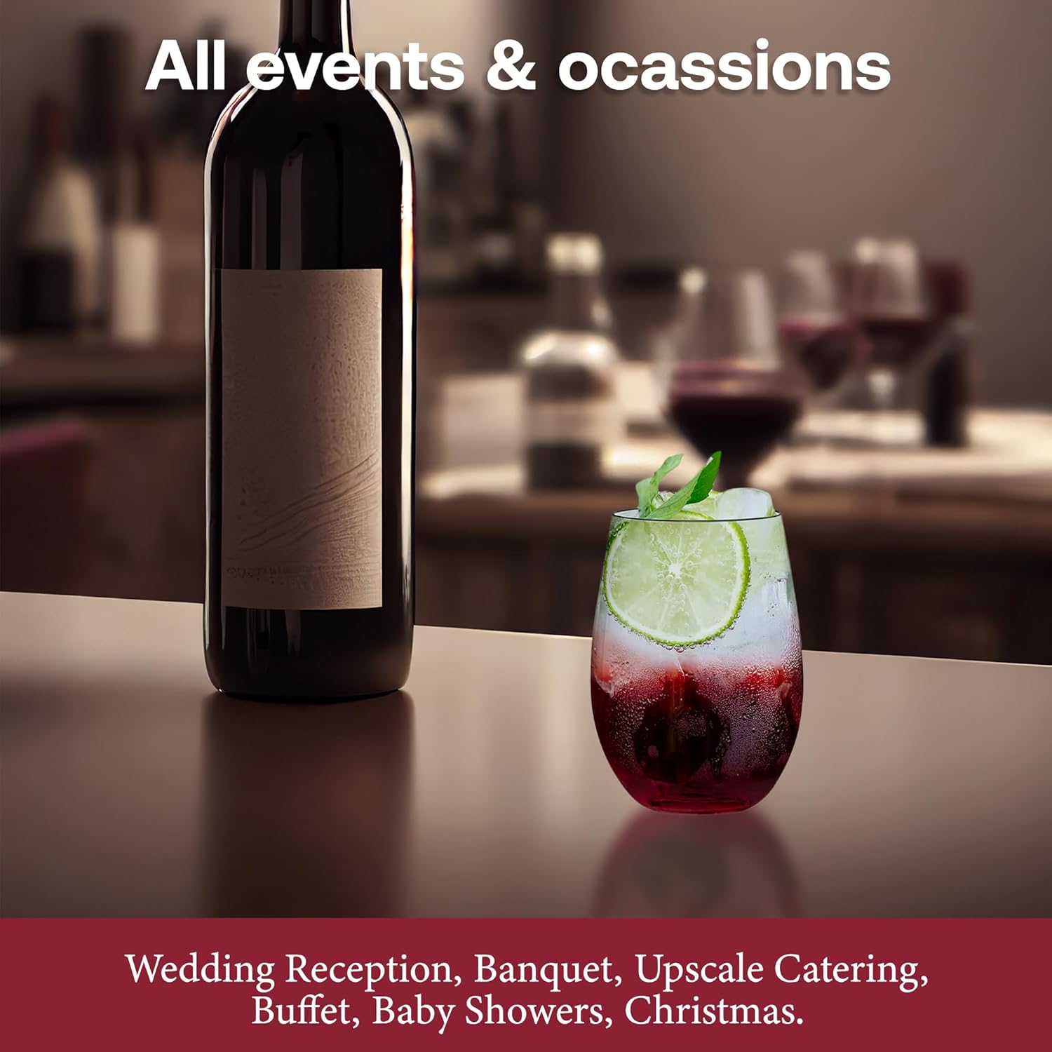 - SLEEK, SPACE-SAVING DESIGN – These wine glasses plastic are stackable and easy to store, with a clear, stemless design that adds a chic, modern touch to any occasion, from formal to casual events.