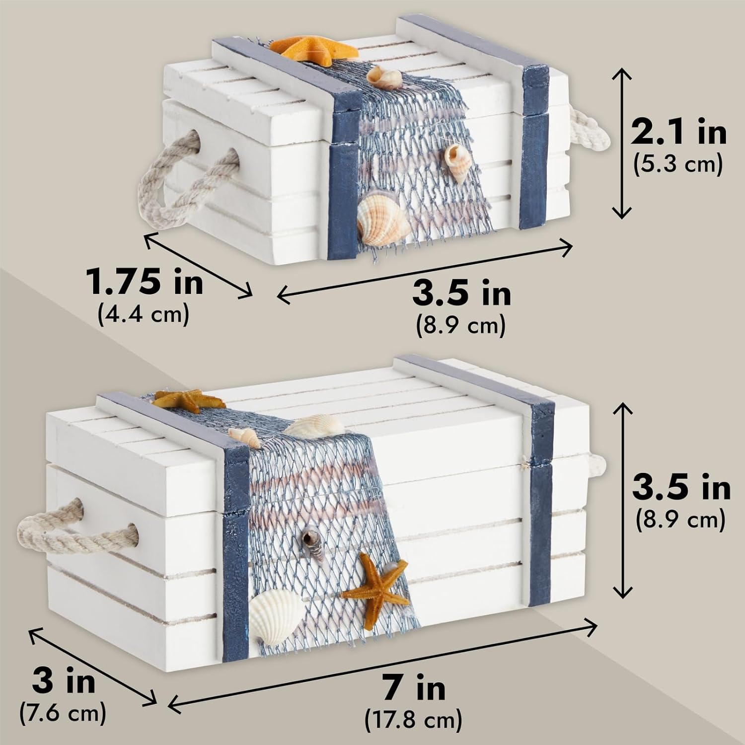 - Versatile Decorative Accent: These decorative coastal boxes serve not only as stylish organizers but also as eye-catching centerpieces for tables. Their refined design enhances any beach-themed room decor, adding a touch of elegant nautical decor