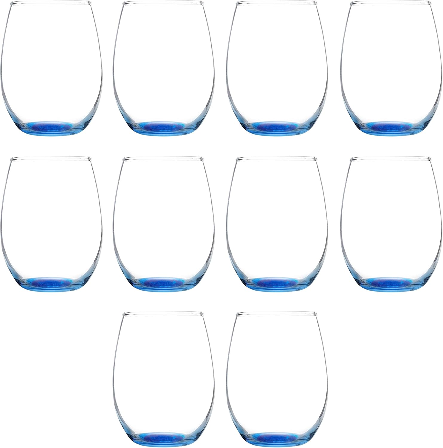 DISCOUNT PROMOS Stemless Wine Glass 9 oz. Set of 10, Bulk Pack - Great for Wedding Favors, Bachelorette Party and More - Blue Bottom Color