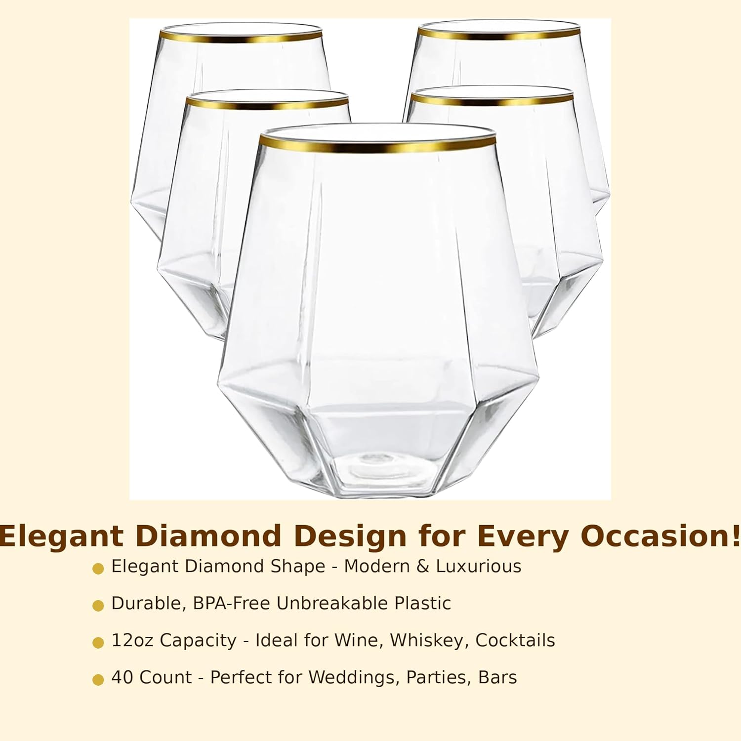 40 count Diamond Unbreakable Stemless Plastic Wine Champagne Whiskey Glasses Elegant Durable Disposable Indoor Outdoor Ideal for Home, Office, Bars, Wedding, 12 Ounce Cups Gold Rim (Gold)
