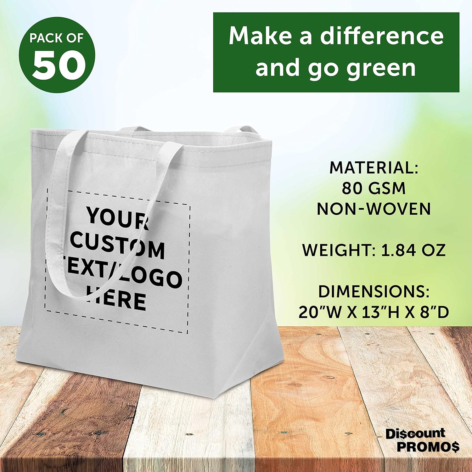 DISCOUNT PROMOS Custom Southern Style Grocery Tote Bags Set of 50 - Personalized Bulk Pack, Reusable Grocery & Shopping Bags - Great for Travel, Carry on Bag, Business Promotions - White - 20"X13"X8"