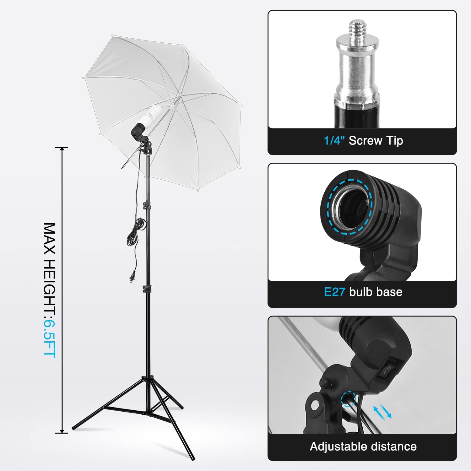 - 【2x Photography Umbrella】33 inch diameter lighting umbrellas diffuse light, weaken shadows, make model portrait and product shooting softer and more delicate, get ideal lighting effect by matching with common softbox or flash. The height of light stand can be adjusted between 26inch-79inch. manually adjust distance between light bulbs & umbrella to get best light.