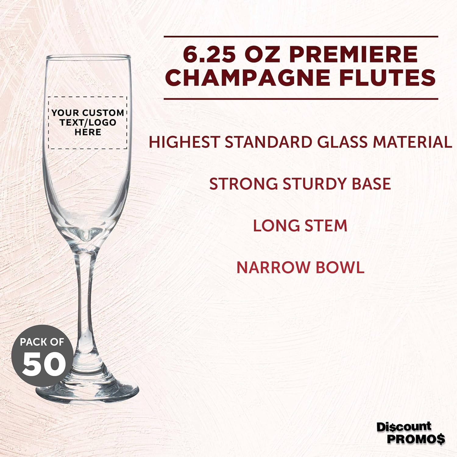 DISCOUNT PROMOS Custom Premiere Champagne Flutes 6.25 oz. Set of 50, Personalized Bulk Pack - Elegant Drinkware for Weddings, Events, & Promotional Gifts - Clear