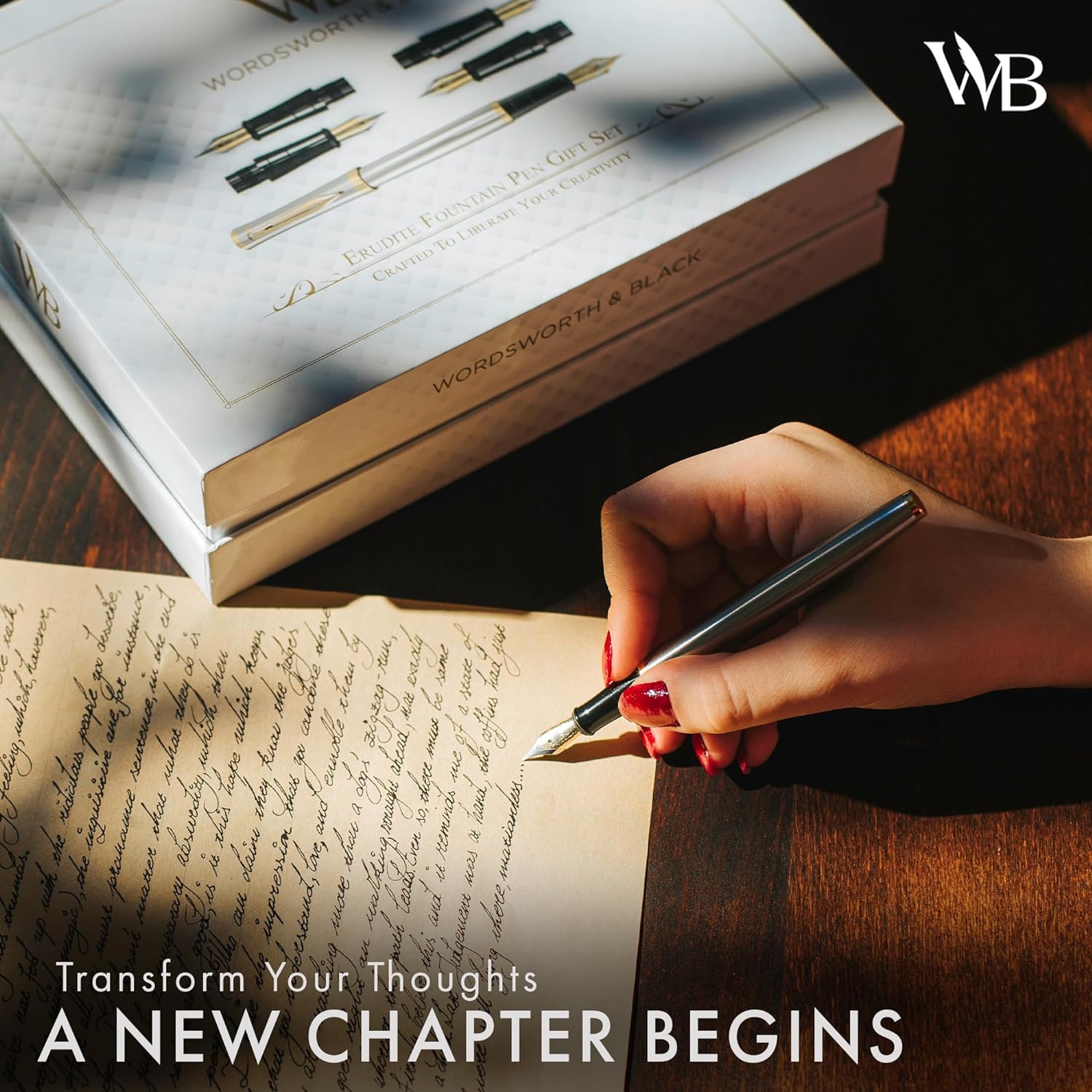 Wordsworth & Black Fountain Pen Gift Set, Includes Ink Bottle, 6 Ink Cartridges & A Refill Converter, 4 Replacement Nibs, Premium Package, Journaling, Calligraphy, Smooth Writing Pens [Silver Chrome]