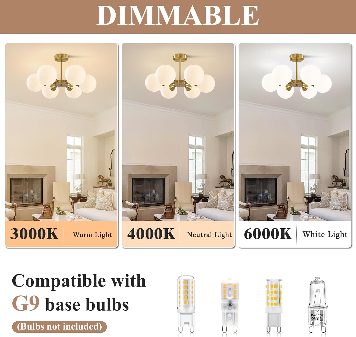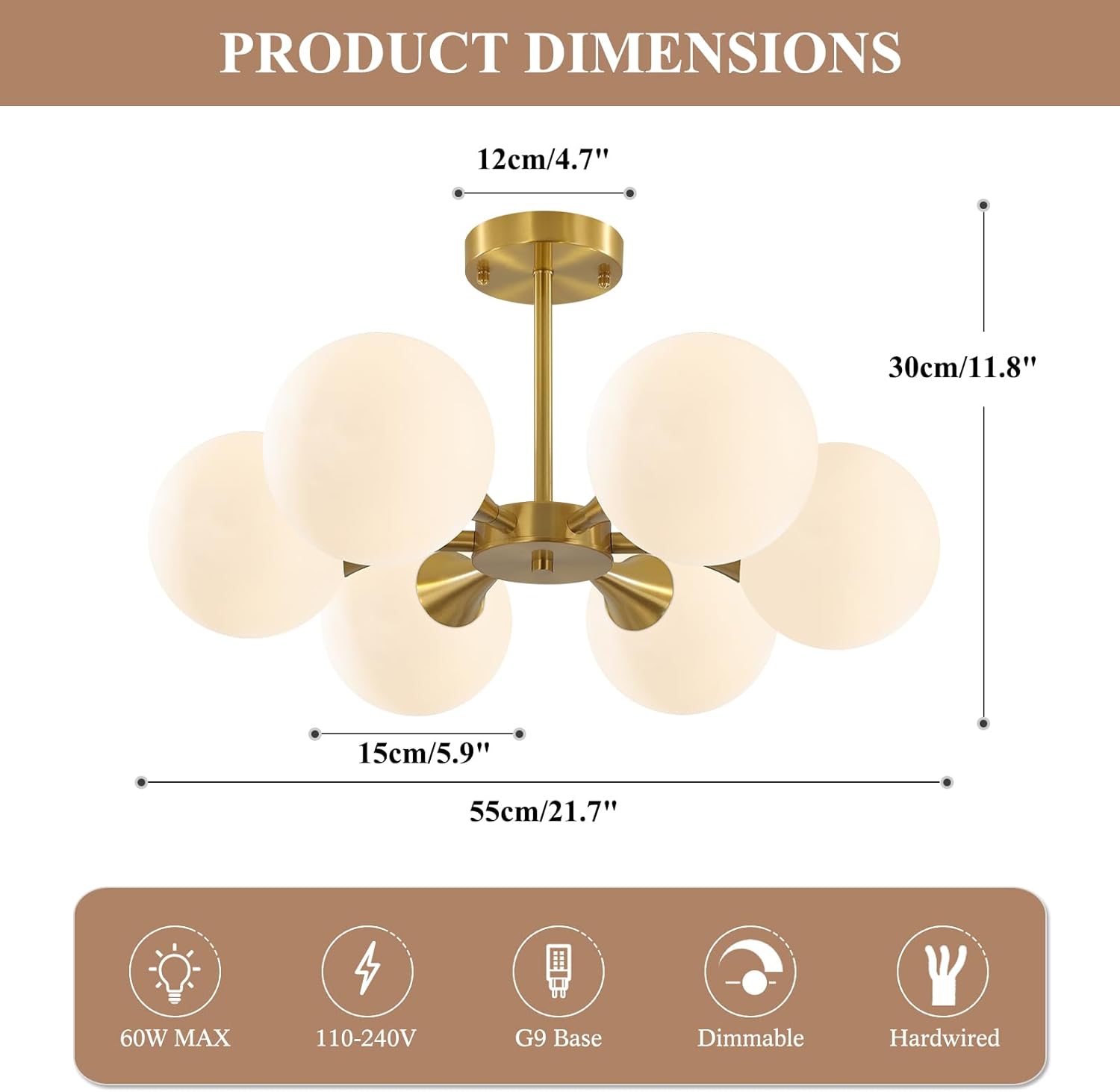 - Chandelier Size : The gold semi concealed ceiling lamp width: 21.7”(55cm), height: 11.8”(30cm), globe diameter: 5.9”(15cm), canopy: 4.7”(12cm). Light source: E26 (bulb replacement ASIN: B0CMTNJ9JW), voltage: 110-220V for worldwide. The mid century bedroom ceiling light can be dimmable when use with dimmable bulb and switch