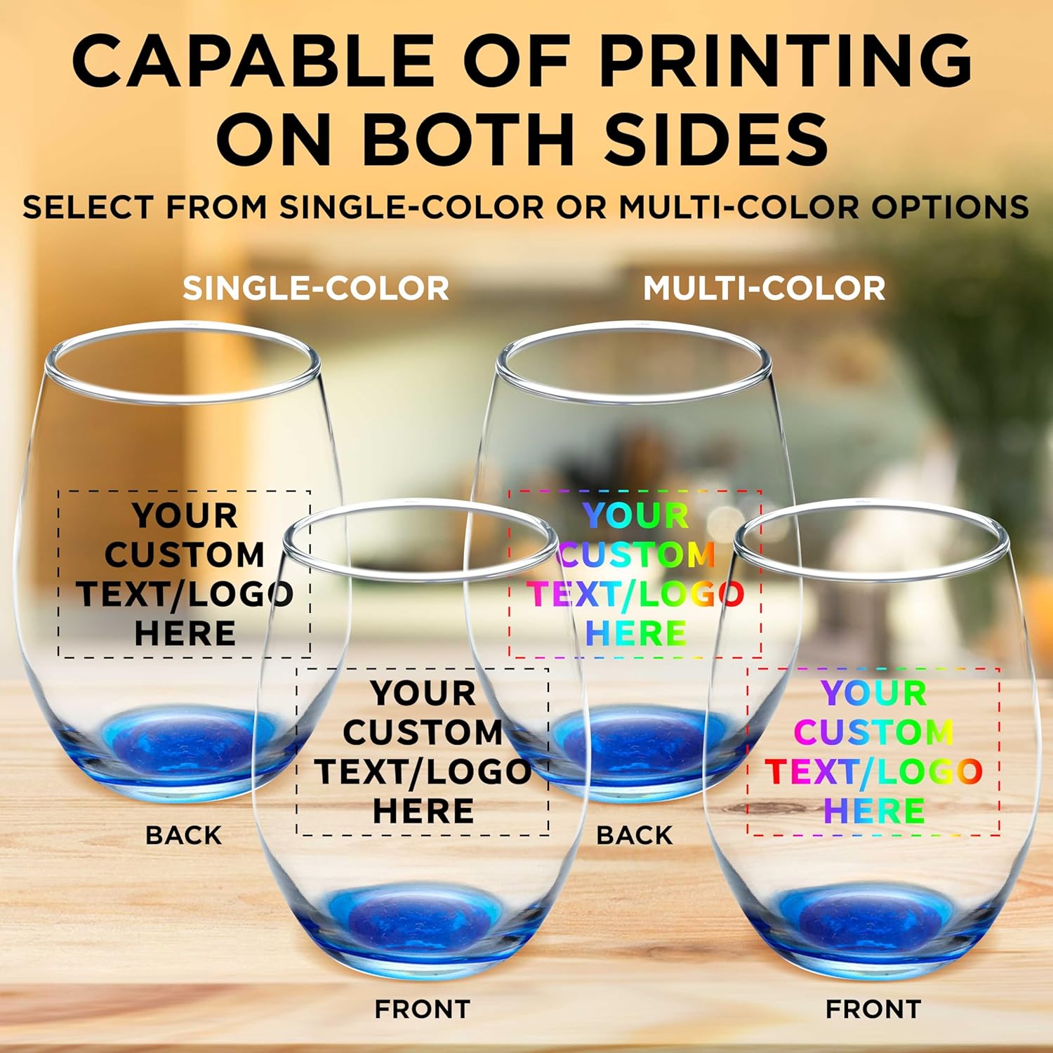 - CUSTOMIZABLE & AVAILABLE IN VARIOUS COLORS - Available with a base in clear, blue, black, green pink, red, or purple. Order our stemless wine glasses etched or engraved and add your brand name, logo, and event dates. Or purchase blank and enhance your décor.