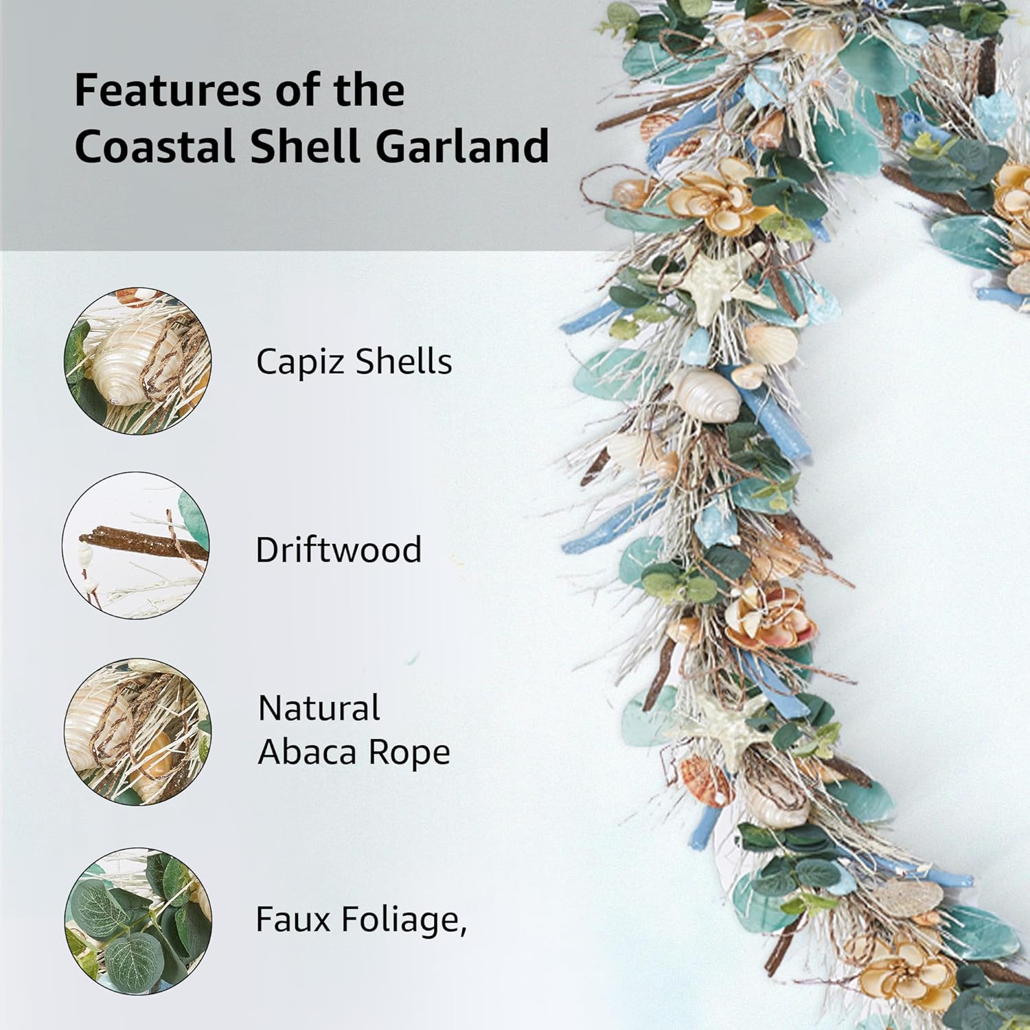 - HANDCRAFTED COASTAL GARLAND – Experience the serene beauty of the coast with HOLIDAY TREE's 5' Garland. This handcrafted piece features natural shells, driftwood, and twigs, carefully chosen in soothing shades of blue, white, and turquoise to evoke a peaceful coastal landscape.