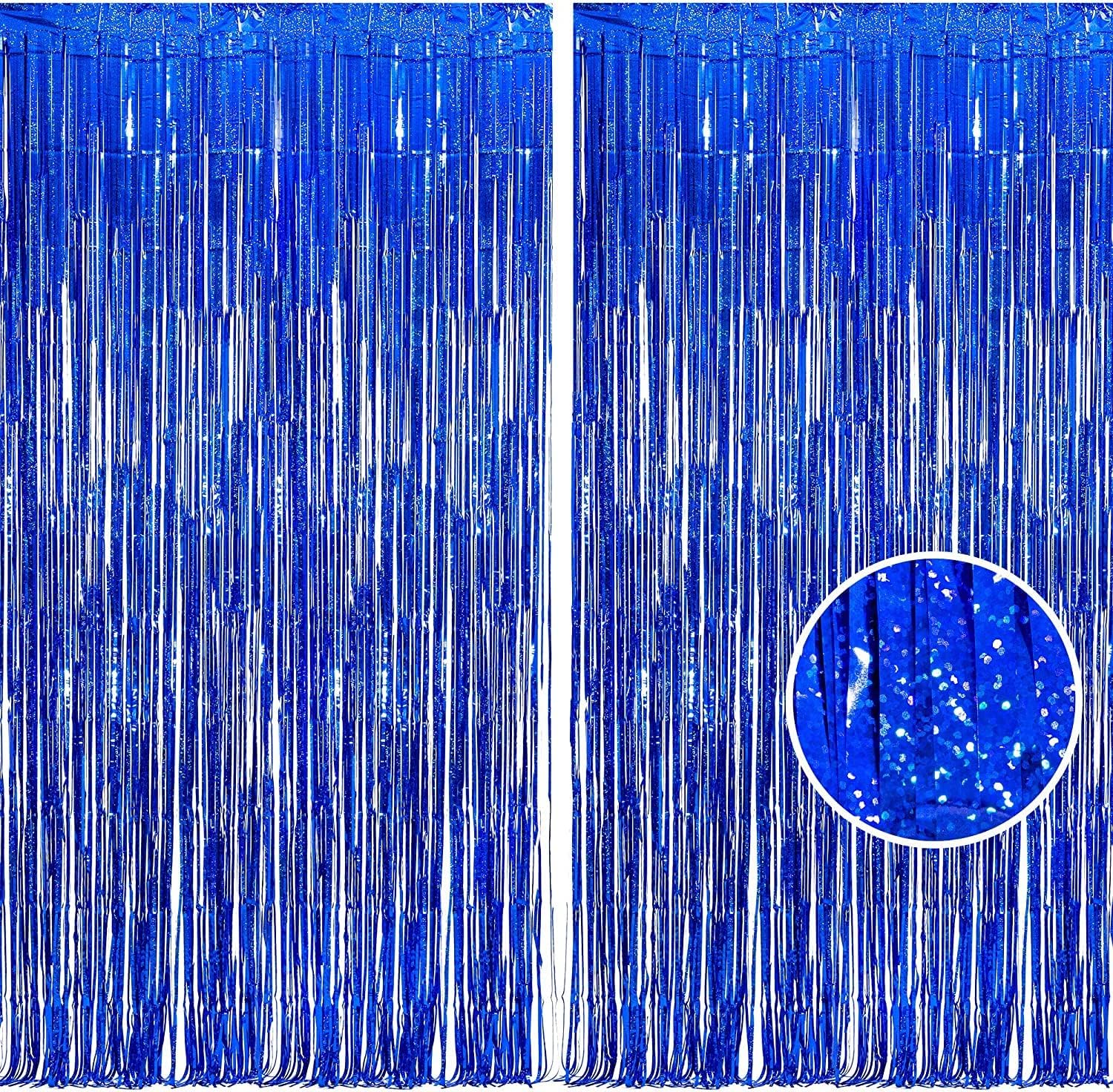 BRAVESHINE Blue Tinsel Foil Fringe Curtains - 2Pcs 3.2x8.2 ft Metallic Holidays Photo Backdrop for Boys Men Birthdays Homecoming Bachelor Bachelorette Engagement Sea Theme Ramadan Party Decorations