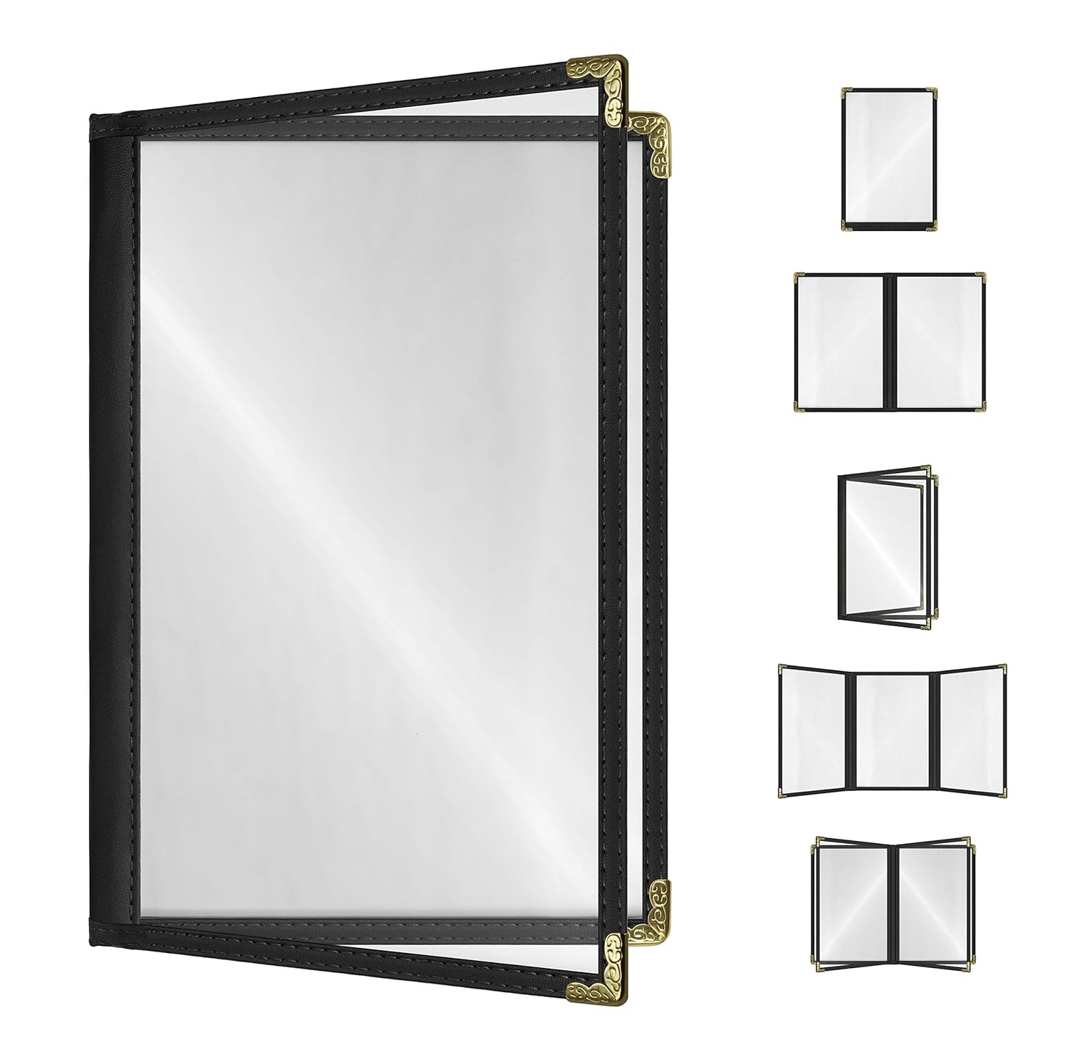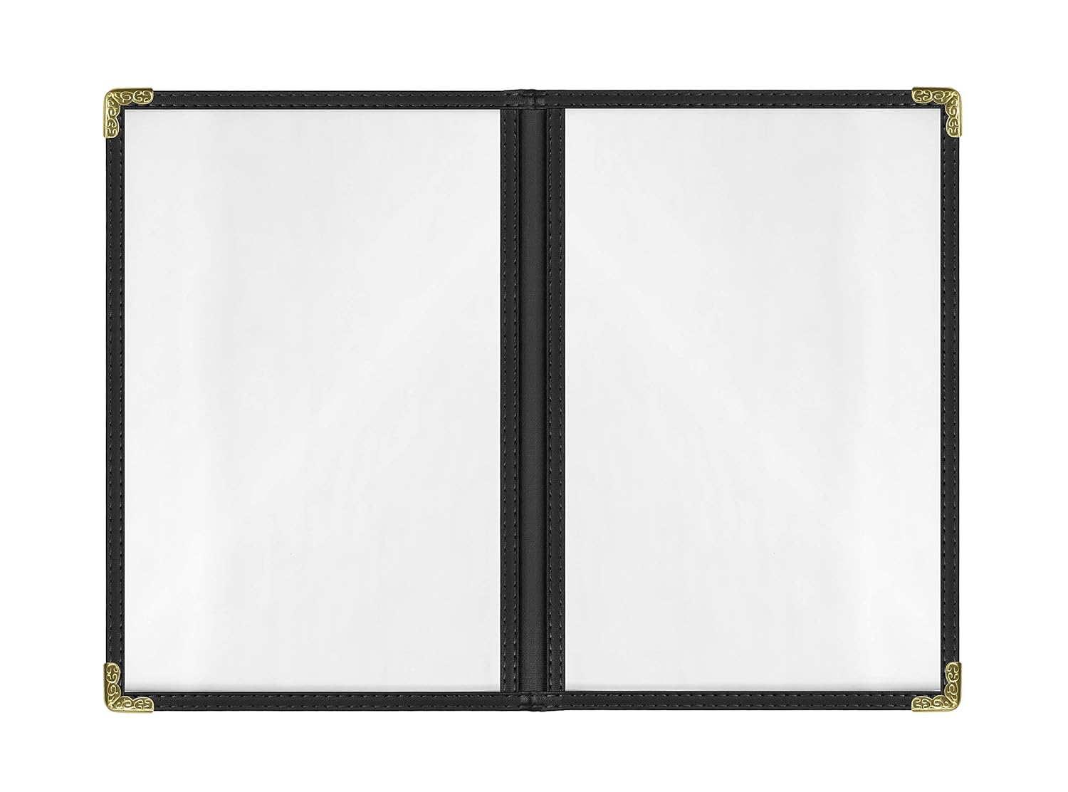 Goodsmart Restaurant Menu Covers – 25 Pack Black 4-View, Side-Loading Menu Holders, Vinyl & Plastic Café Menu Covers, Clear Menu Sleeves, Fits 5.5" x 8.5", Leather-Style Design, Gold Corners