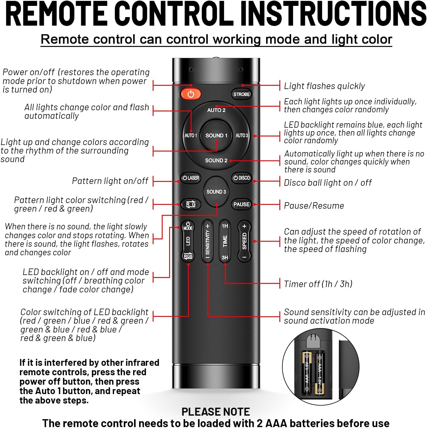 - Remote control and memory functions 📱 When the party disco light is enabled, it will automatically restore the working mode before shutting down. The disco party light comes with a remote control, you can freely turn on/off any lens light, change the lighting mode, speed, sensitivity, the party light also has an automatic off timer, you can set it to turn off after 1 or 3 hours.