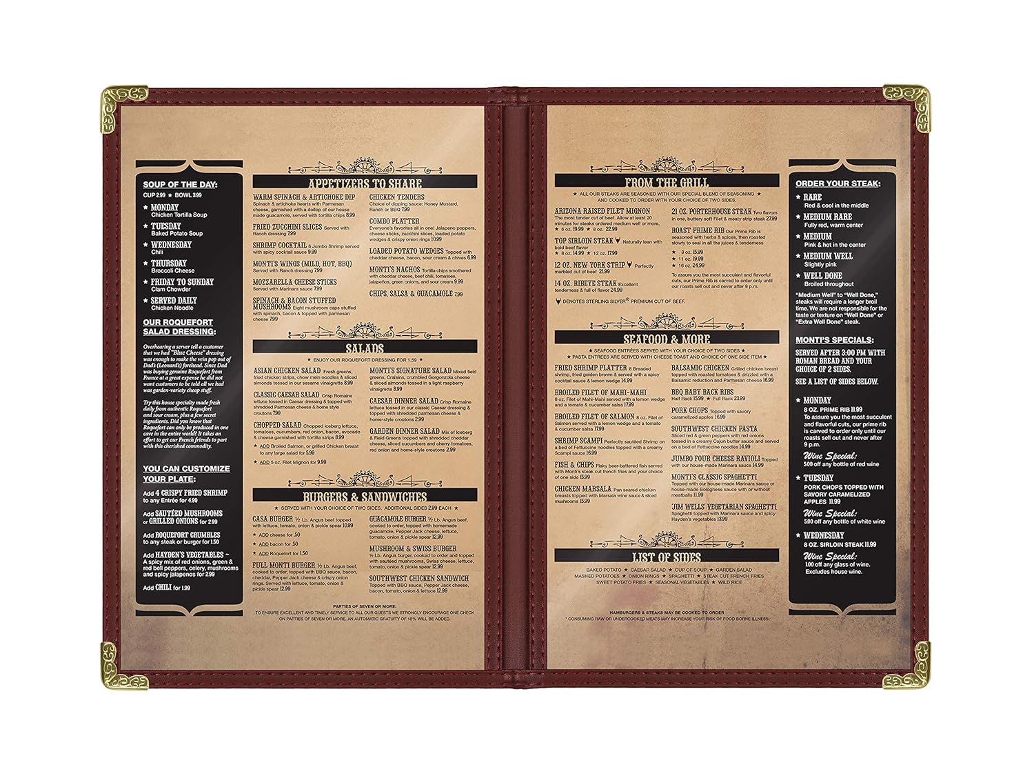 - ✅Sophisticated Burgundy with Gold Accents: The elegant burgundy border and gold decorative corners add a refined touch to the menu cover, enhancing the presentation and creating a professional and polished look suitable for upscale or themed restaurants and cafes.