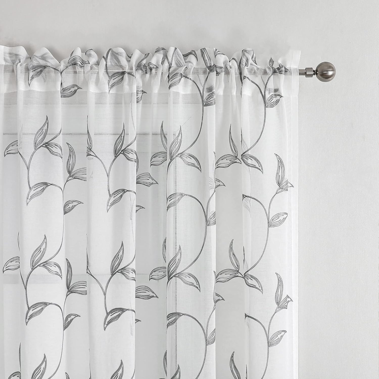 VISIONTEX Sheer Curtains 63 Inch Length 2 Panels, Decor Iron Grey Vine Leaves Embroidery on White Voile Pair, Accent Semi Window Drapes for Kitchen, Living Room and Bedroom, 54" W x 63" L