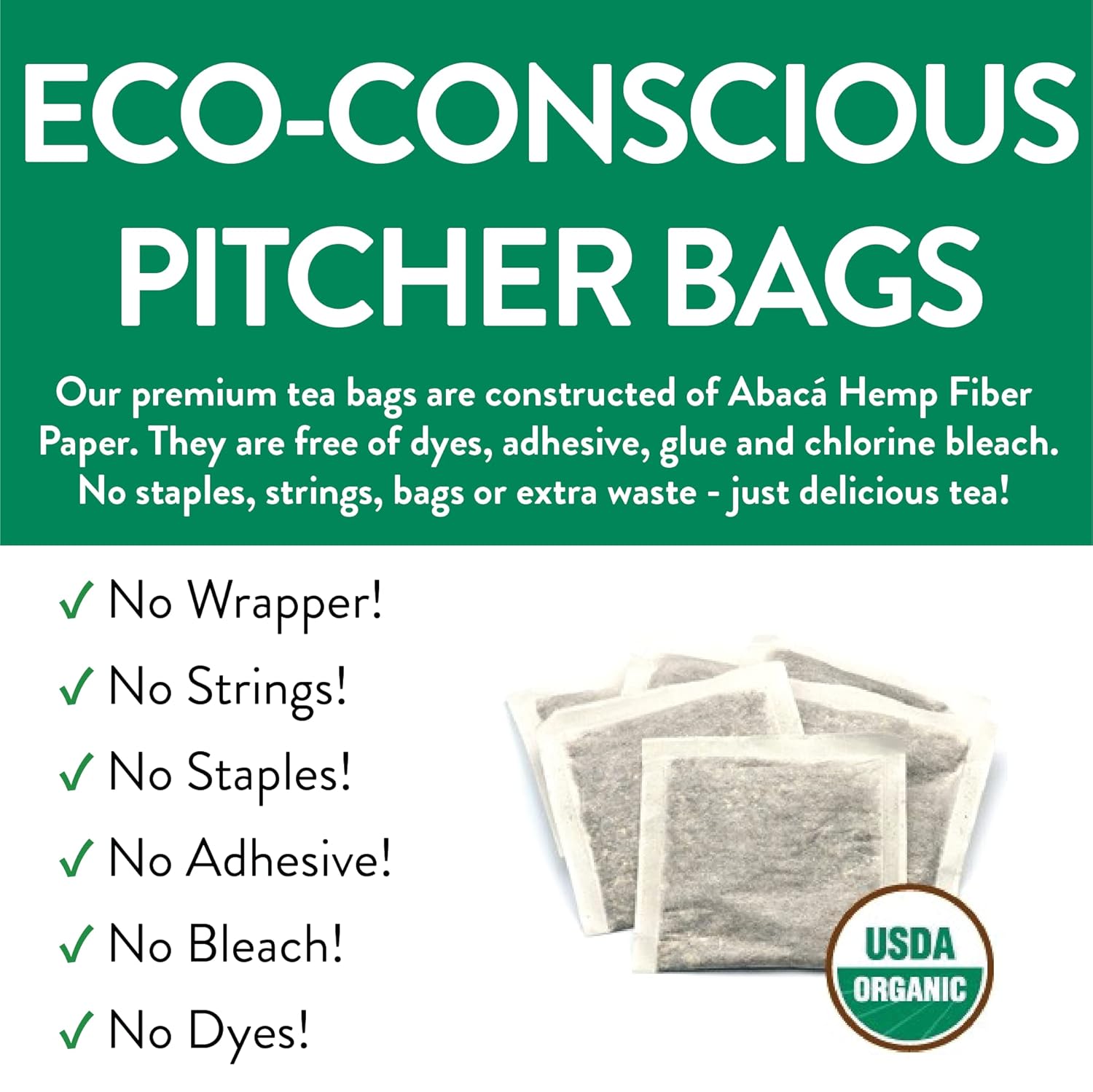 - 36 ECO-CONSCIOUS TEA BAGS - Our premium tea bags are constructed of Abacá Hemp Fiber Paper. They are free of dyes, adhesive, glue and chlorine bleach. No staples, strings, bags or extra waste - just delicious tea!