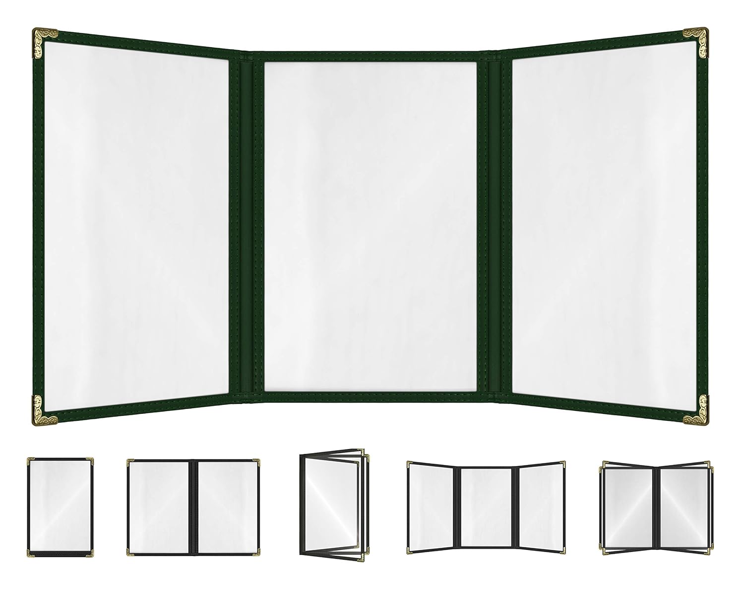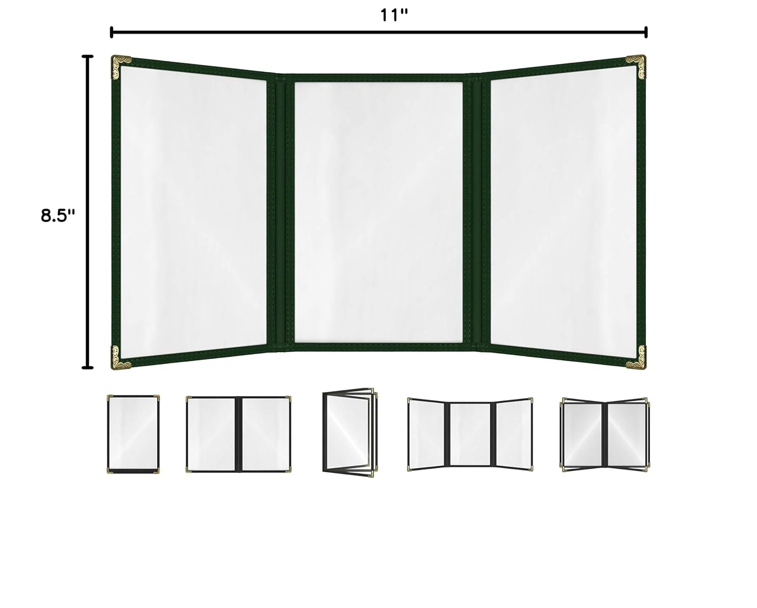 Goodsmart Restaurant Menu Covers – 25 Pack Green 6-View Trifold 8.5" x 11", Side-Loading Vinyl & Plastic Menu Holders, Clear Menu Sleeves, Leather-Style Café Covers with Gold Corners