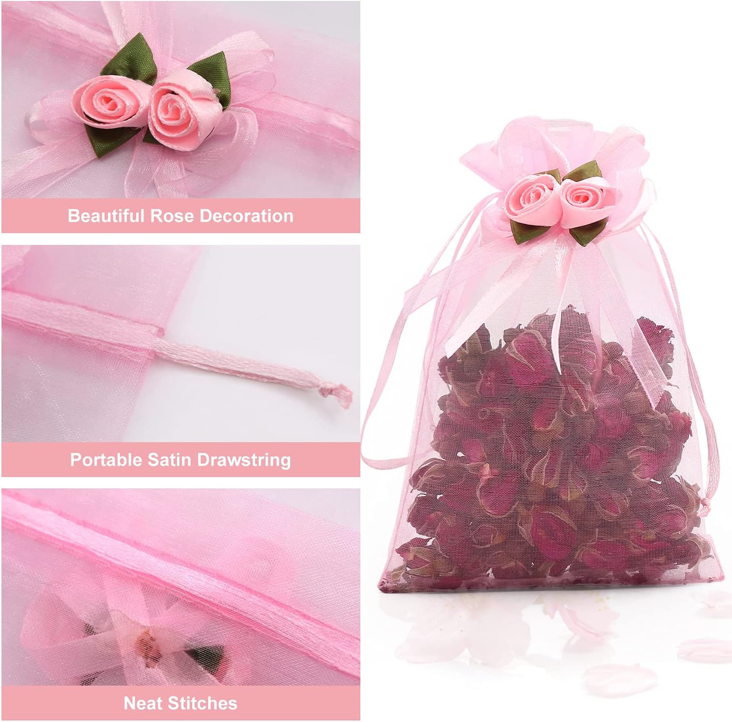 - Rose Decoration: Pink rose decorated organza bags, adding cute and lovely tint to your occasions