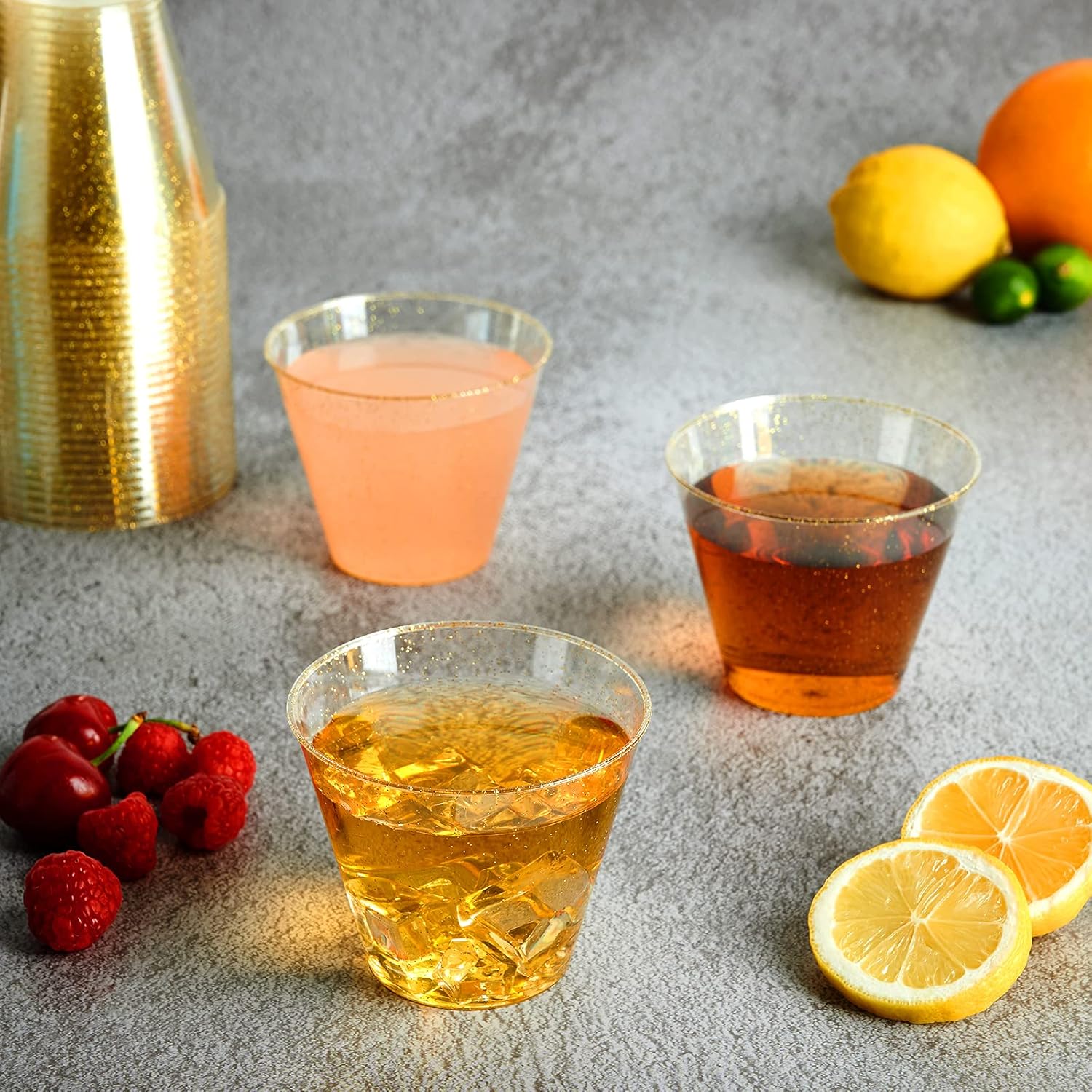 - Great Value: Every package includes 100 pack 9 oz gold glitter plastic cups for home, event, or commercial use, perfect for wine, champagne, juice, beer, liquor and various mixed drinks, Don't worry about the mess after the party! Just toss the cups when you're done