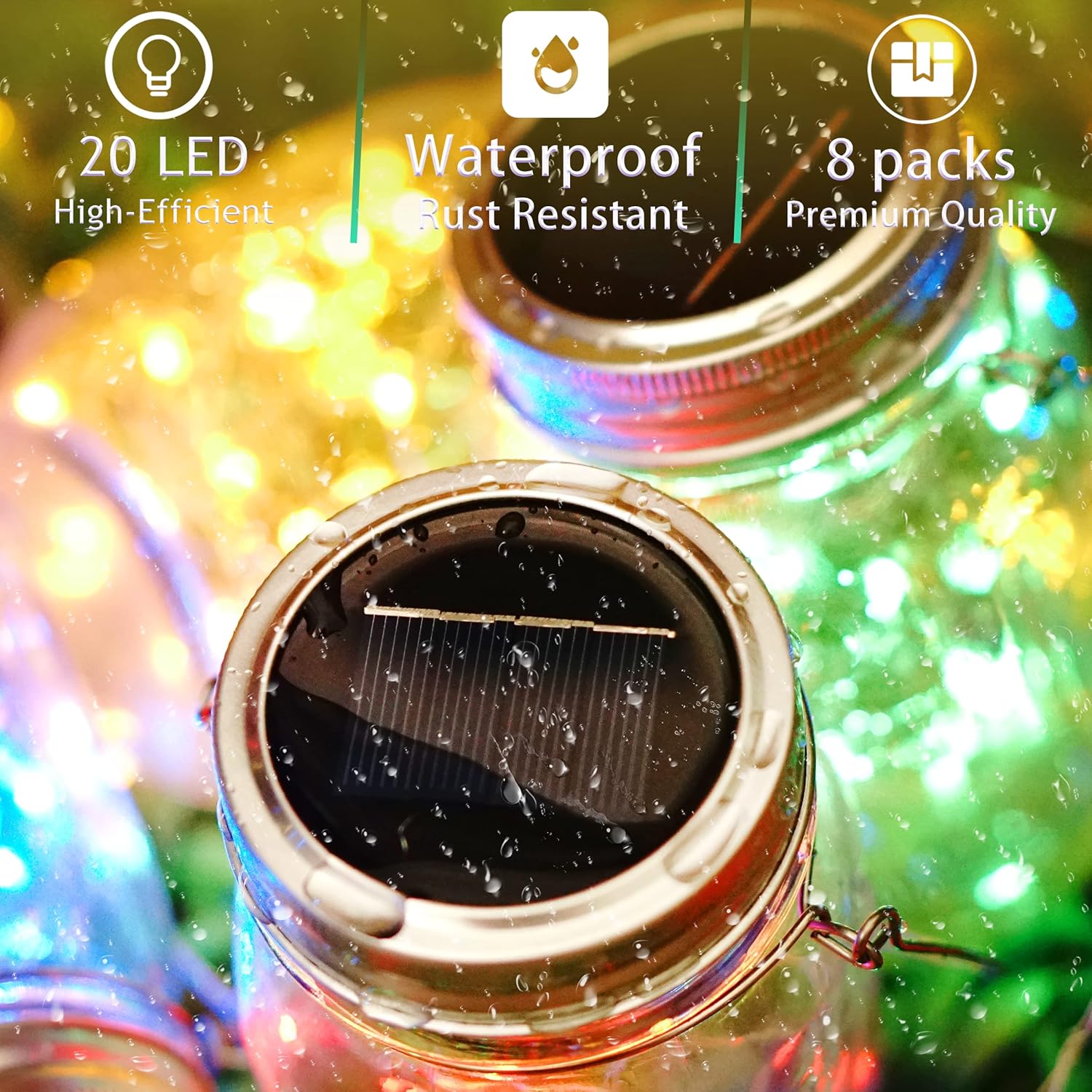 Solar Mason Jar Lights [Updated], 8 Pack 20 LED Waterproof Fairy Firefly Jar Lids String Lights with Hangers(NO Jars), Patio Yard Garden Wedding Decoration - Multi-Colored