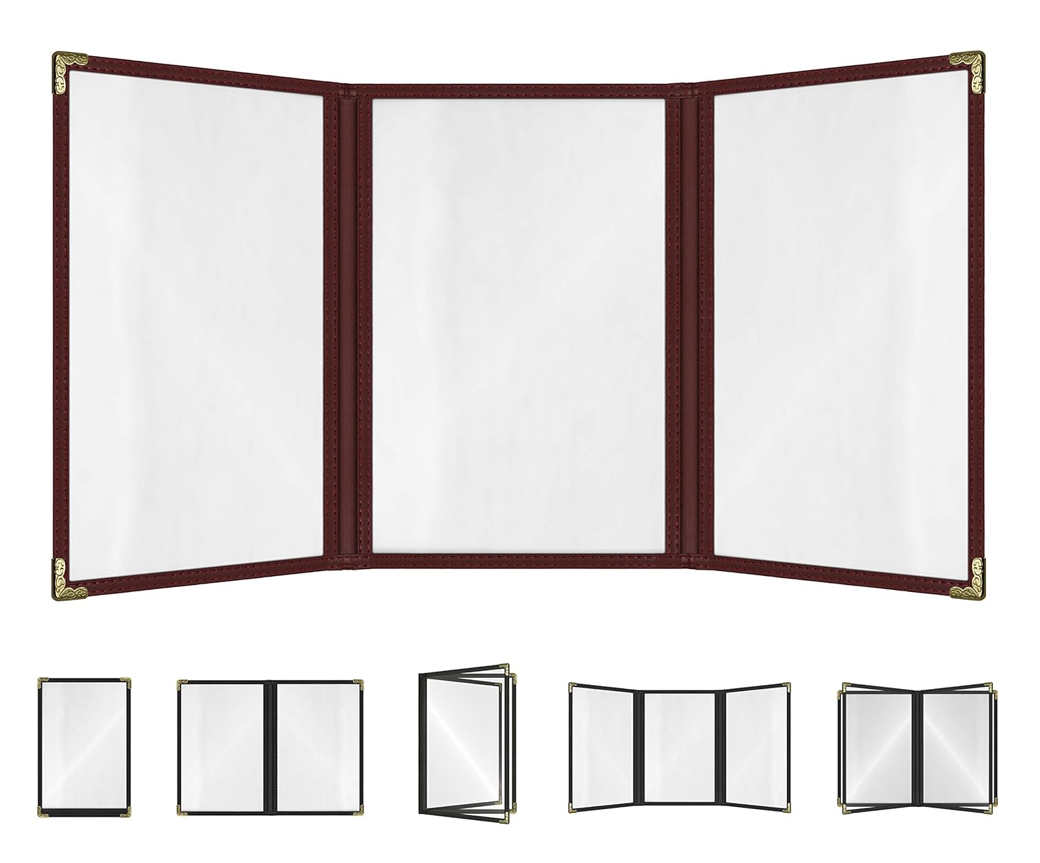 Goodsmart Restaurant Menu Covers – Burgundy, 25 Pack, 6-View Trifold 5.5" x 8.5", Side-Loading Vinyl & Plastic Menu Holders, Clear Menu Sleeves, Leather-Style Café Covers with Gold Corners