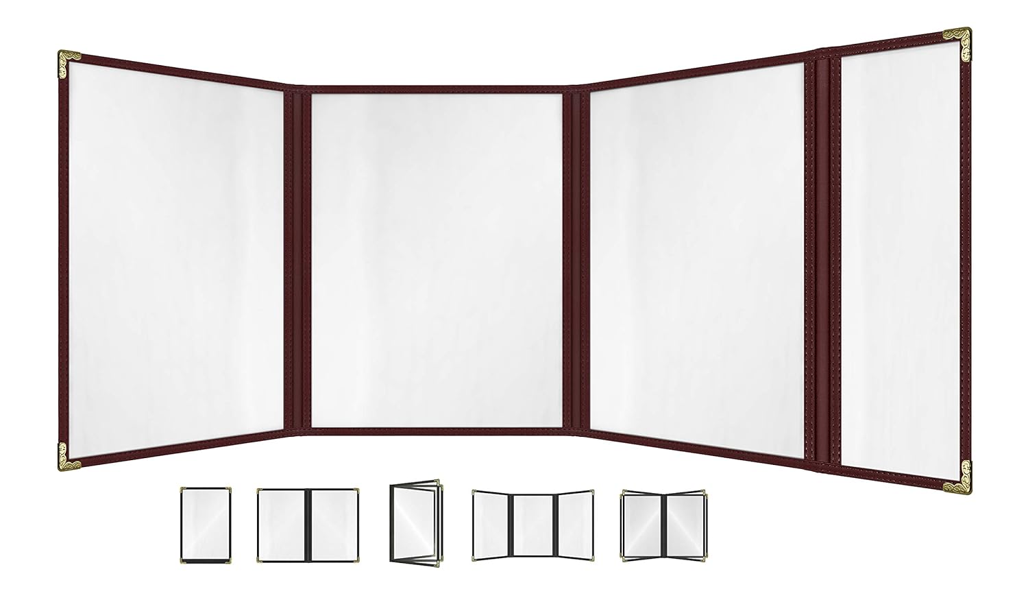 Goodsmart Restaurant Menu Covers – 25 Pack Burgundy Quadfold 8-View, Side-Loading Menu Holders, Vinyl & Plastic Café Menu Covers, Clear Menu Sleeves, Fits 8.5" x 11" & 4.25" x 11", Gold Corners