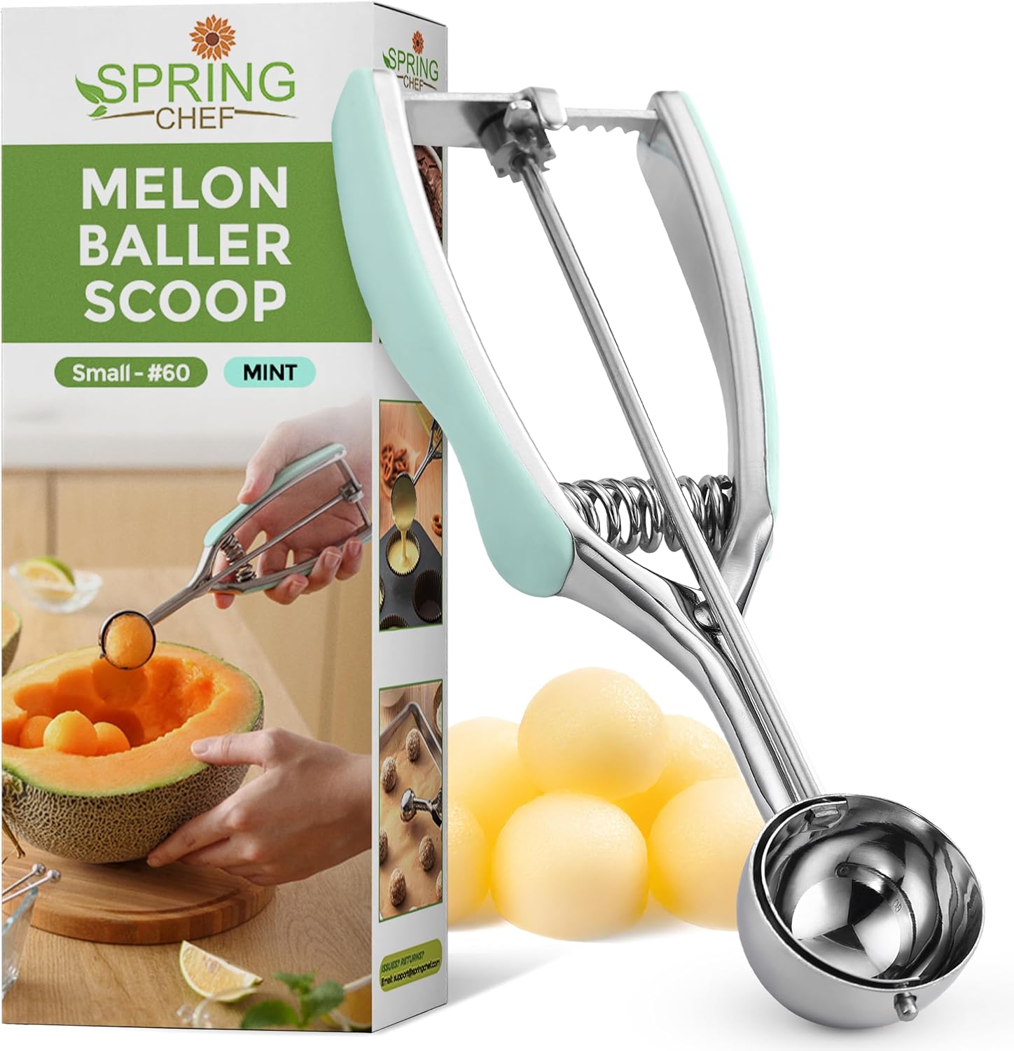 Spring Chef - Mint Small Cookie Scoop for Baking, Multifunctional #60 Melon Baller with Trigger Release for Watermelon, Ice Cream, Protein Ball, Stainless Steel Scooper, 1 Tbsp Cookie Dough Scoop