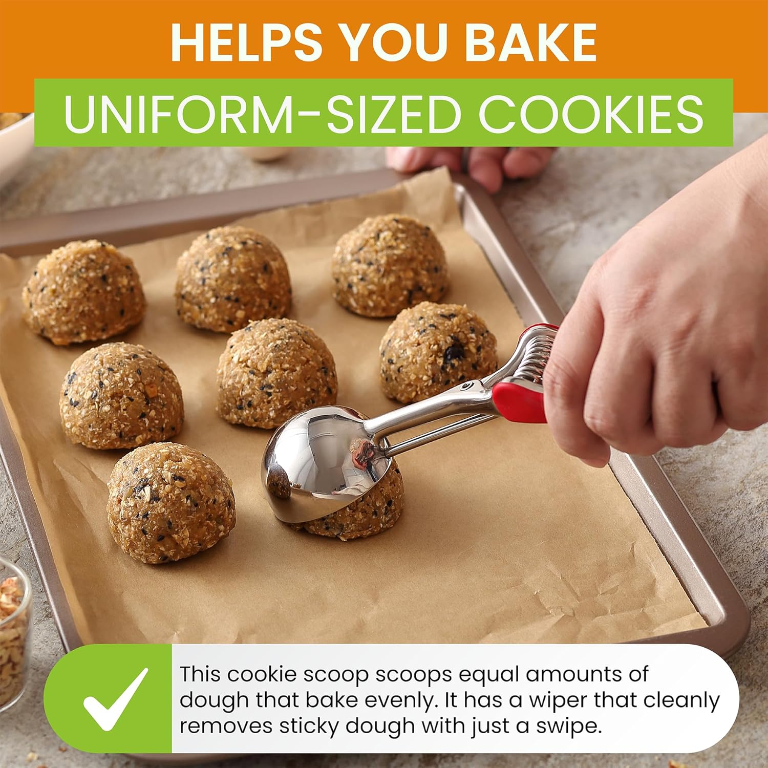 - Easy to Use - Using this cookie scooper for baking allows you to scoop effortlessly. It releases your cookie dough with a simple squeeze of the trigger, so you can make “store-bought-quality” cookies right at home. The metal cookie scoop is Dishwasher Safe making cleanup a breeze.