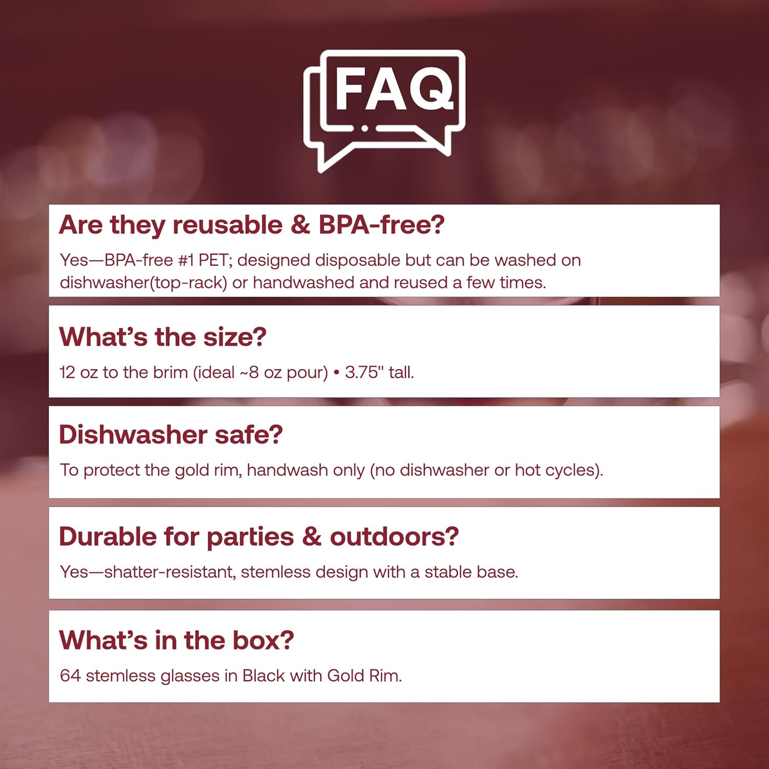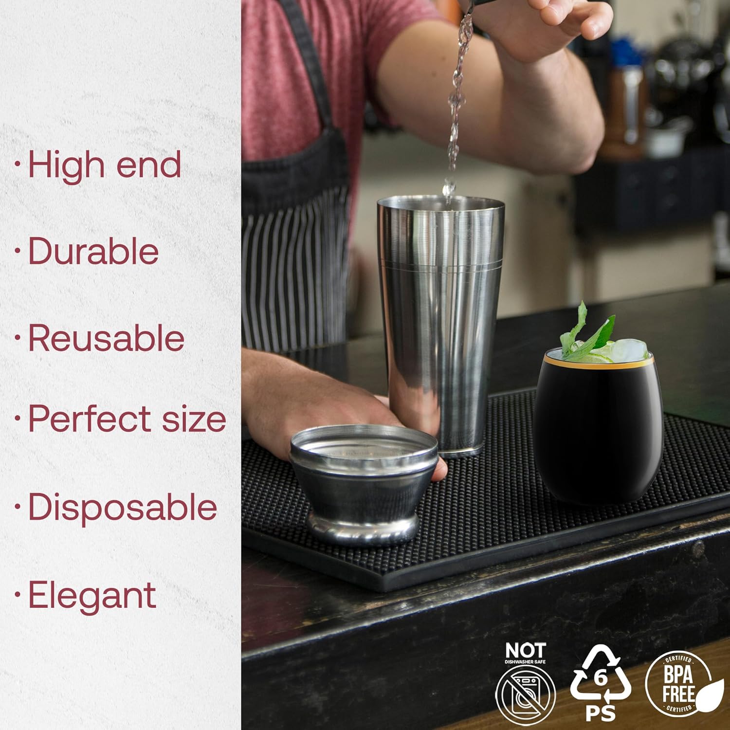 - ELEGANT BLACK & GOLD STEMLESS DESIGN – Make a statement with these stylish 12 oz stemless wine glasses featuring a sleek black body and refined gold rim, ideal for elevating any event’s aesthetic.