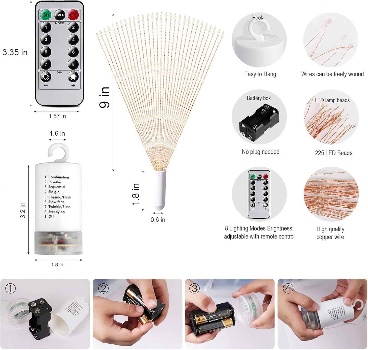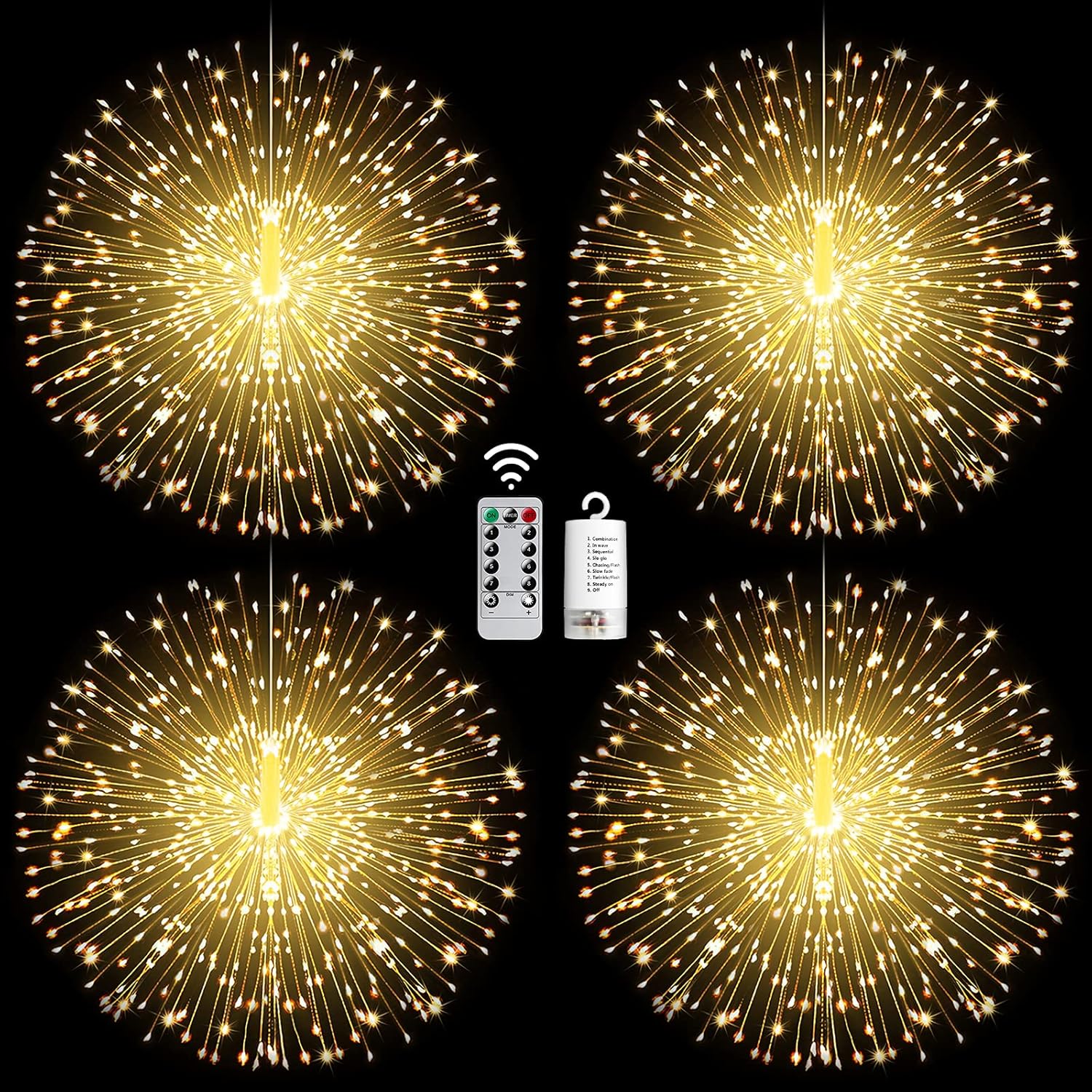 4 Pack String Lights - 225 LED 8 Modes Dimmable with Remote Control, Waterproof Copper Wire Decorative Hanging Bursting Star Lights for Party, Patio, Garden Decoration (Warm White)