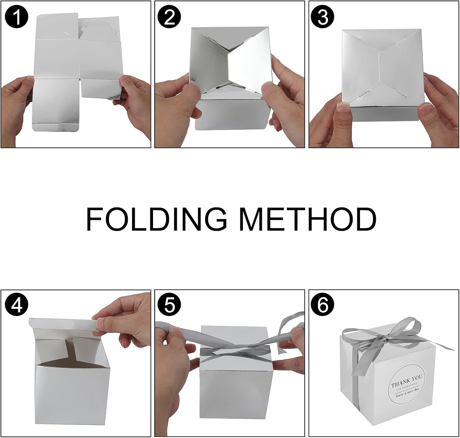 - What You'll Get: 100pcs Metallic Silver favor boxes,100pcs slver ribbons and 100pcs Thank you stickers. you can tie a bow knot on top, which will be more elegant and romantic for party.