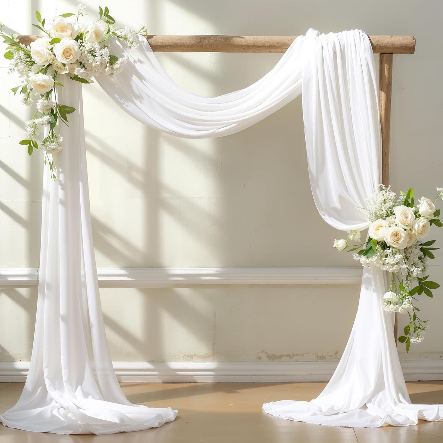 - What You Get: Including 2 panels white chiffon wedding arch drapes, each panel is 29" wide by 6 Yards (216 inches) long. Voile sheer chiffon draping fabric are good choice to decorate your wedding arch arbor.
